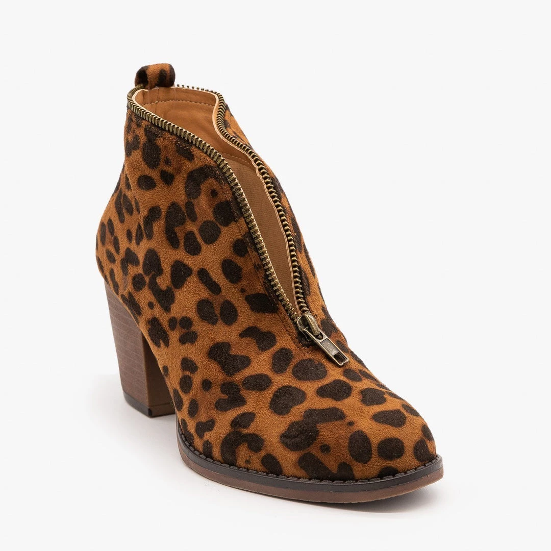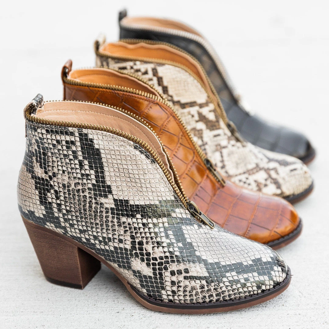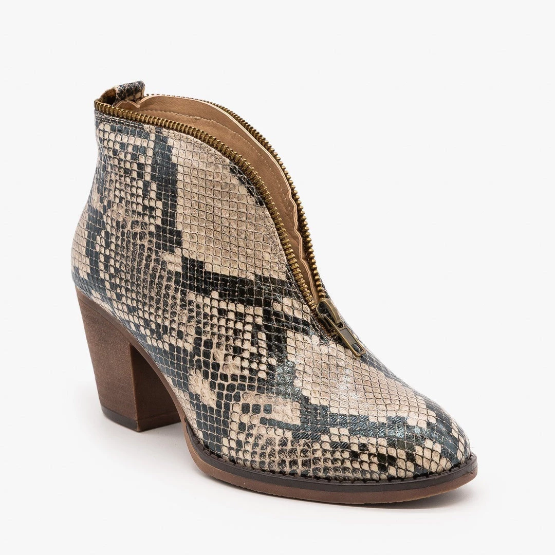 Don’t miss your chance to add these gorgeous Mata Shoes Leader-3 booties to your wardrobe! Crafted from faux suede (leopard) or faux leather (black snake, light snake, tan, black), these booties feature an approx. 3.5″ block heel that adds some height but is still easy to walk in and a cute almond shaped toe. The body of the boot is sleek and smooth and features a fashionable animal print design. A zipper runs from the front of the foot all the way to the top, splitting around the ankle to add a cool decorative touch. This zipper can be worn down for a more cut-out look or zipped up, depending on what you like. Pair these booties with black skinny jeans, a cropped, dark colored sweater and a drop necklace for a perfect date night look! Made with all man-made/vegan materials.