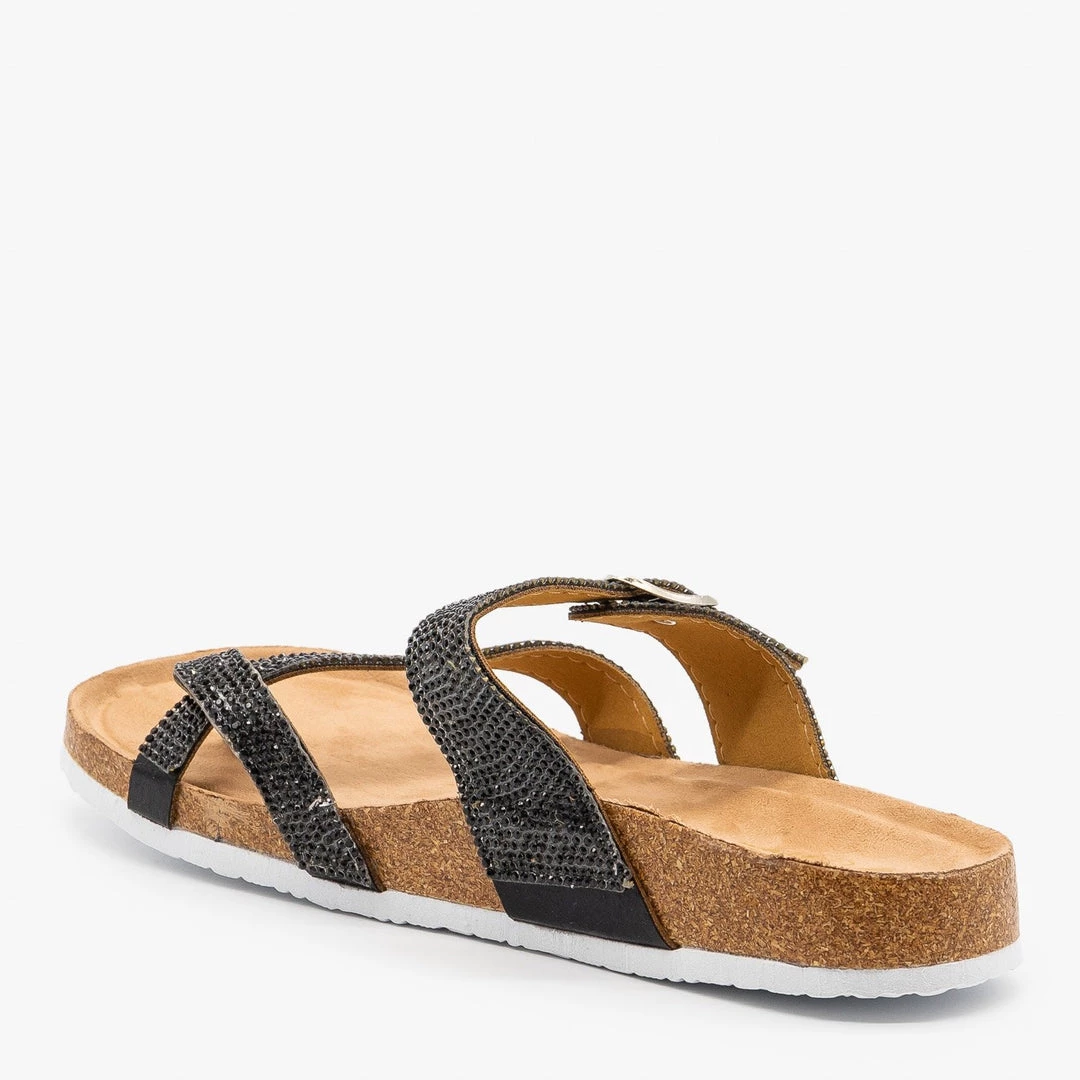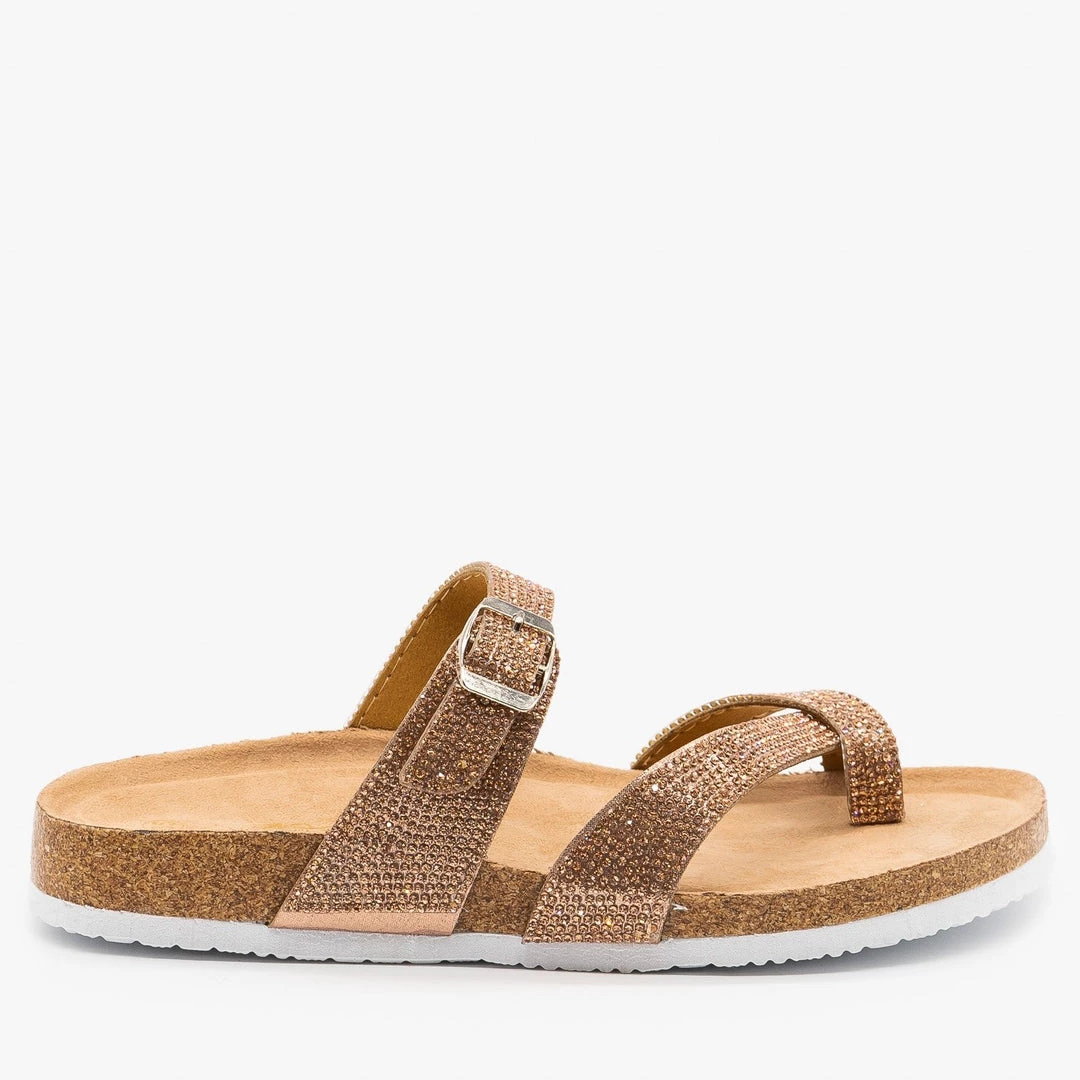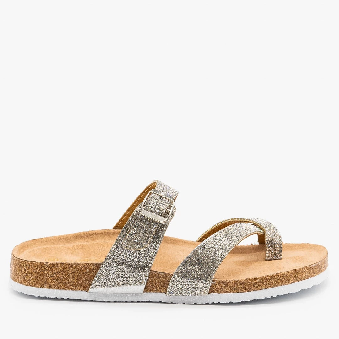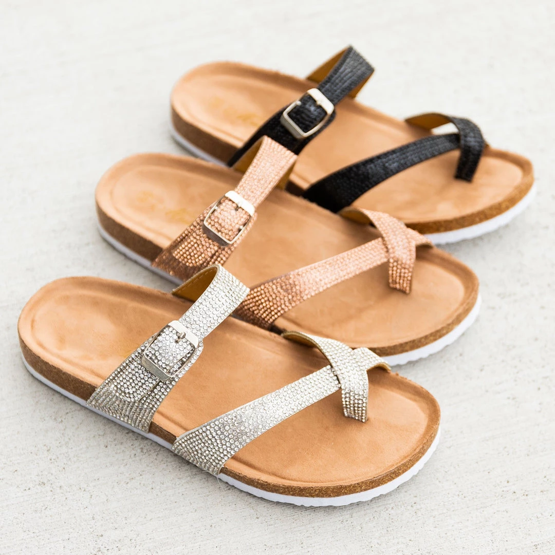 Add some sparkle to your look with these fun Mata Shoes Shine-3 sandals! Crafted with faux leather, these sandals feature white foam tread, a trendy cork sole and a toe hold slip on design. Two bands cross the foot, bedazzled with miniature rhinestones in black, silver or rose gold. A decorative buckle adds a little flair to these already stylish shoes! Pair them with your favorite denim and tee combo for an easy casual look! Made with all man-made/vegan materials and runs true to size.