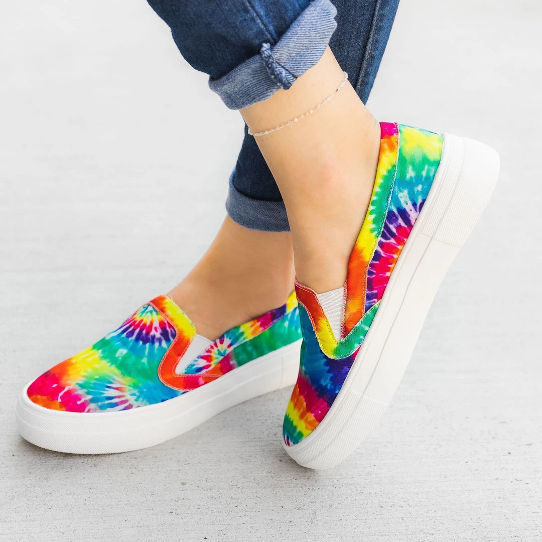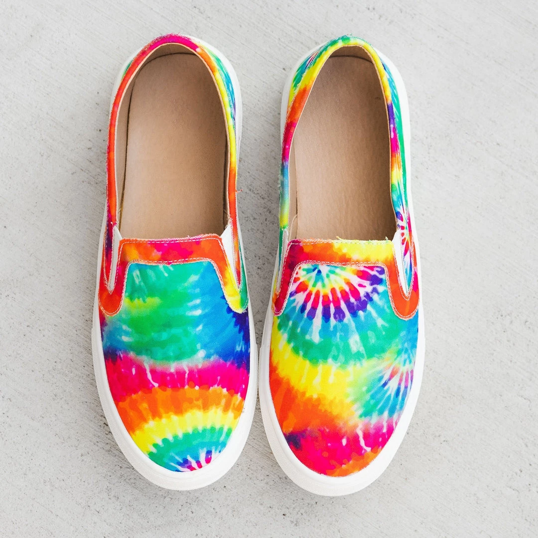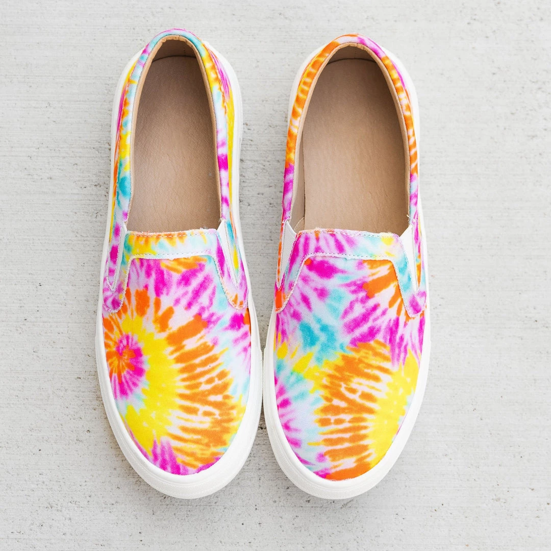 Get the perfect casual shoe that will make any outfit pop with our new Coco-1A Tie-Dye sneakers! These fun shoes are crafted with a canvas material body with a trendy tie-dye design. An all white sole gives this sneaker a classic feel and provides comfort for all day wear. No laces? No problem slip these shoes on with ease for an easy grab-and-go style. Pair these shoes with white cut out skinny jeans and a graphic tee for an artsy styled fit! This shoe is man made with all vegan materials. Take your perfect size as this shoe runs true to size.Â