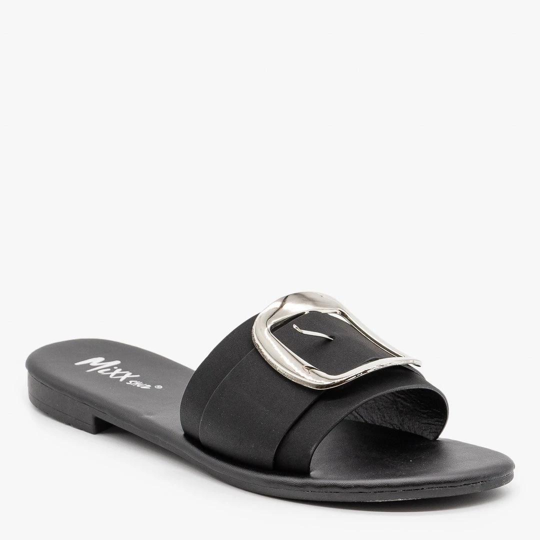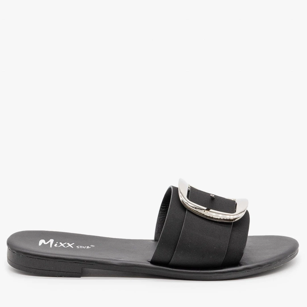 Put your best foot forward in these cute Mixx Shoes Orchids sandals! Designed with faux leather, these sandals feature a flat heel, lightly cushioned insole and a simple slip on, open toe design. The band over the foot has a layered belt with an oversized metallic buckle that adds a classic stylish look. Pair these sandals with your favorite jeans, belt and tee combo for an easy every day look! Made with all man-made/vegan materials and runs true to size.