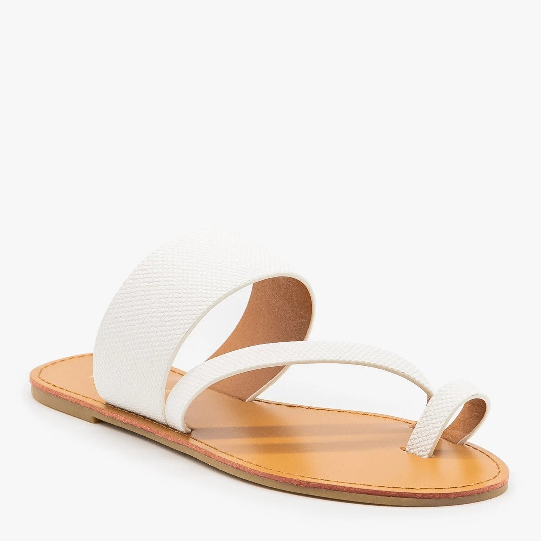 These Mixx Shoes Rex sandals just might be your new go-to shoe! Designed with faux leather, these sandals feature a wide band over the foot and a thin diagonal strap and toe hold. The straps have a textured finish for a subtle upscale yet beachy vibe. With a flat heel and simple slip on design, these sandals are great for everyday wear. Pair them with distressed mom jeans and a white tee for a classic outfit or style them with a flowy maxi skirt and crop top for a more bohemian look!