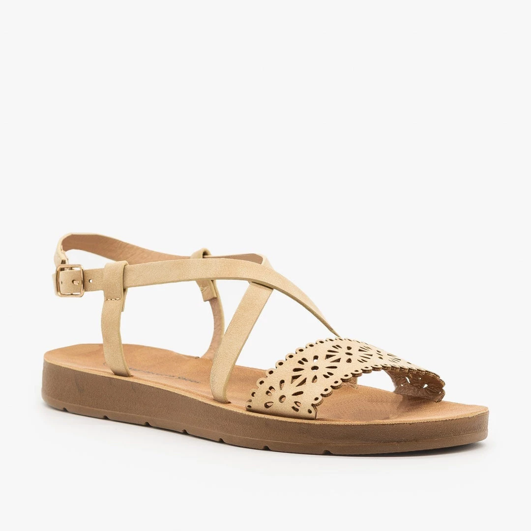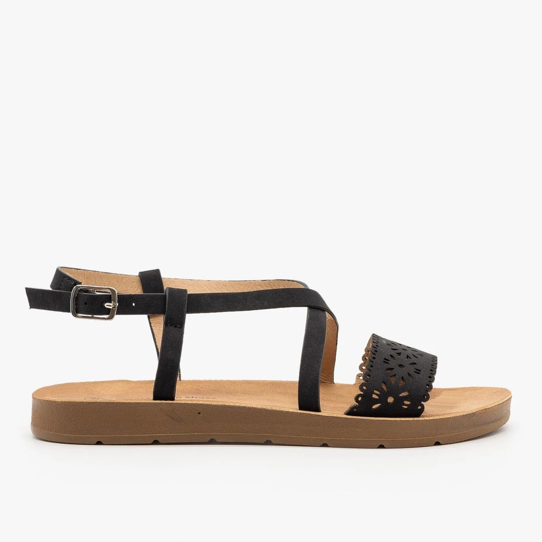 These darling Montecucco Shoes XC-P9201 sandals will put a delicate finishing touch on any look! Crafted with faux leather, these beauties feature a molded sole for lasting comfort, an open toe and a simple strappy design. Two thin straps cross over the foot, loop behind the ankle and clasp with an adjustable buckle. A wider band crosses the toes and is decorated with simple laser cut floral designs that add the perfect finishing touch to this sandal. For a cute warm weather look, pair these sandals with a flowy skirt and a cropped lightweight sweater! Made with all man-made/vegan materials and runs true to size.