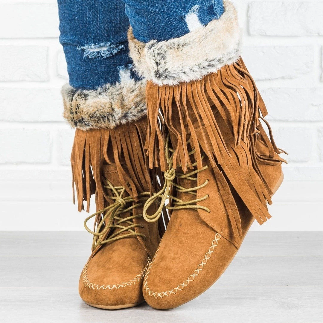 Turn some heads while keeping your feet warm with the Nature Breeze Shoes Cherokee-12 moccasin boots! These beautiful mid-calf moccasin-style boots are made of faux suede and feature a cute, trendy fringe design all around the boots. The flat shoe and inside zipper also make these shoes easy and comfortable enough to wear all day long. These gorgeous boots also have a stitched detailing along the rounded toe of the boot, and feature a lace-up style design. These boots are topped off with an adorable faux fur trimming, just enough to add some style and ultimate coziness to these shoes! Pair these with your favorite leggings or some distressed jeans for a look that will have you ready for the fall/winter months! Made with all man-made/vegan materials and fits true to size.