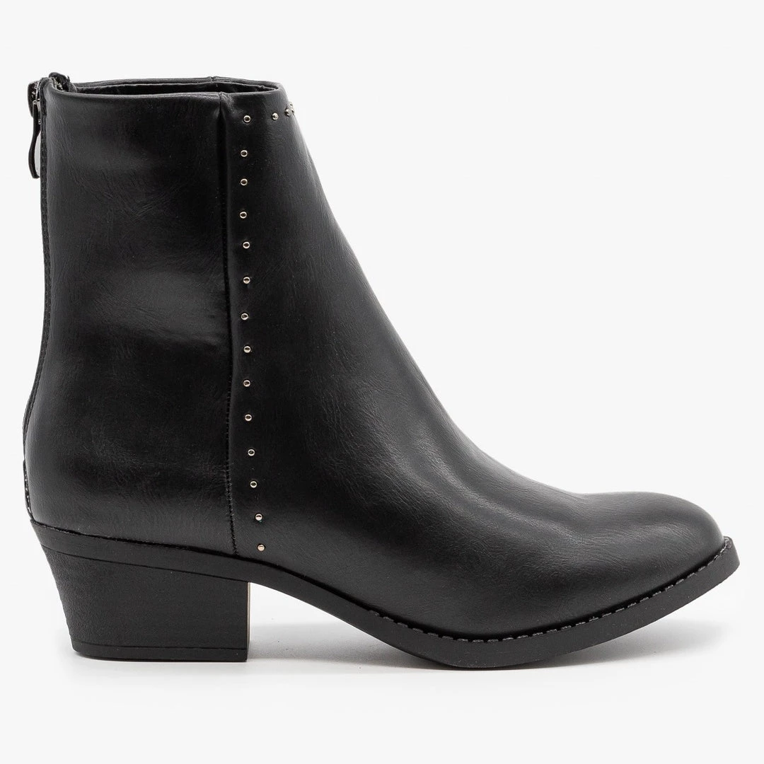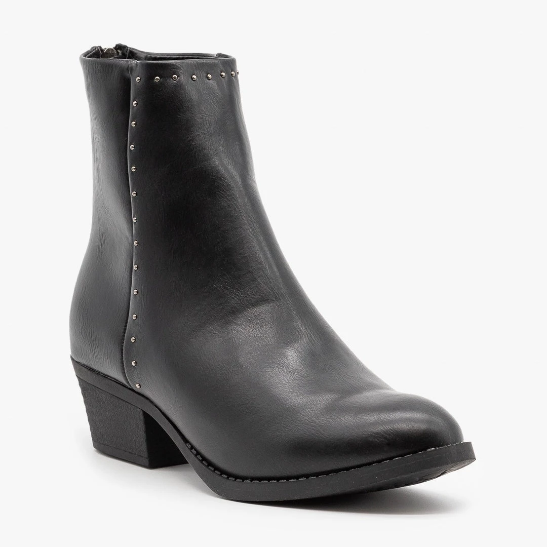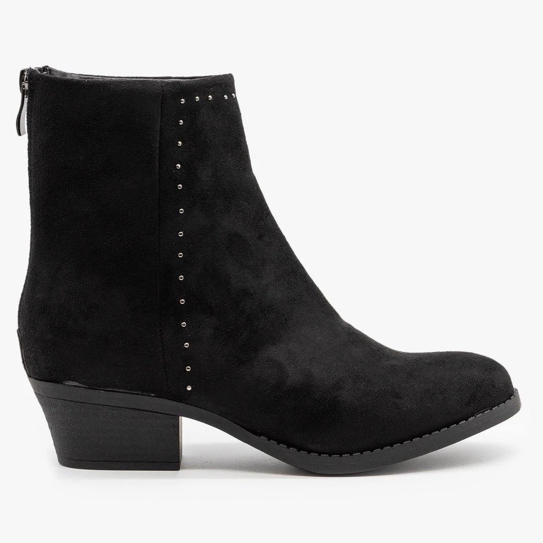 Hit the dusty trail in these west-inspired Nature Breeze Shoes Leah-03 booties! Designed with faux suede or faux leather (black), these booties feature a 2″ angled stacked heel, a stylish almond shaped toe and a back ankle zipper for easy on/off access. The body is super chic and simple, rising to just above the ankle. Small metallic studs accent the shape of the bootie and add a little edge! For an updated western look, pair these booties with cuffed skinny jeans, a turtleneck sweater and an oversized flannel! Made with all man-made/vegan materials and runs true to size.
