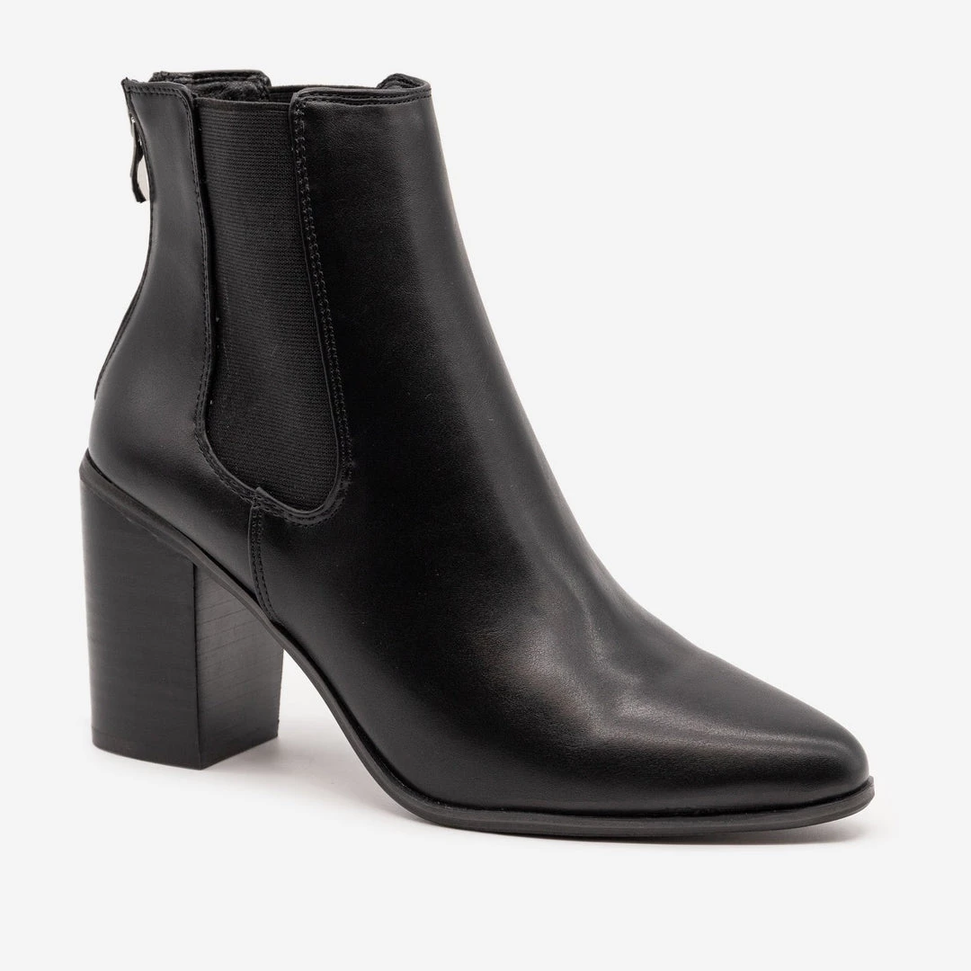 Get sassy with our new Kenna faux leather high-heeled booties! These gorgeous shoes are crafted with side stretch material and back zipper for easy, comfortable wear. These boots feature an approx. 3.25” block heel and almond pointed toe sure to bring all the sass and attitude into any fit! Pair these booties with black denim high waisted jeans and a satin cami for a sleek and edgy look! These shoes are man-made with all vegan materials.Take your perfect size as these shoes run true to size!