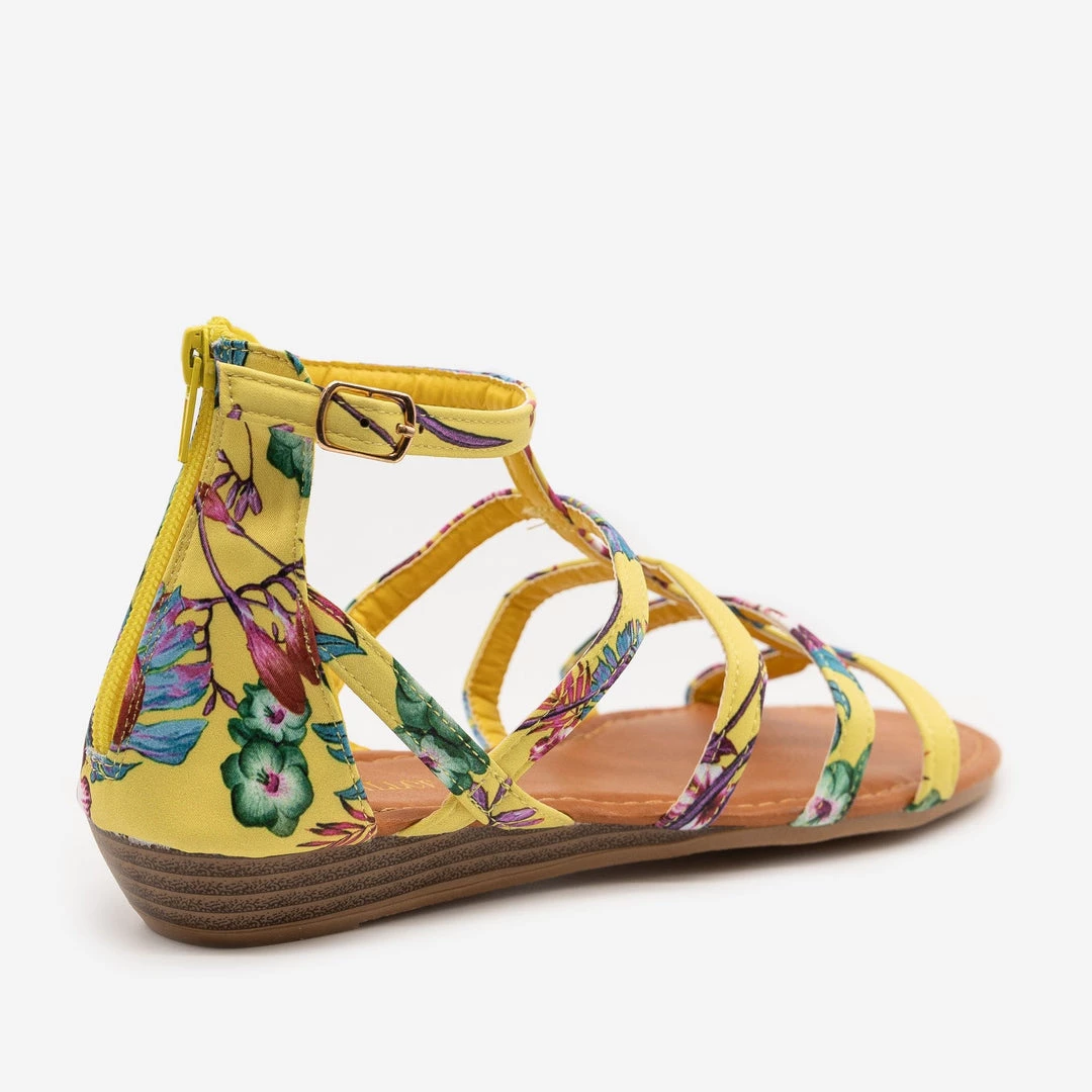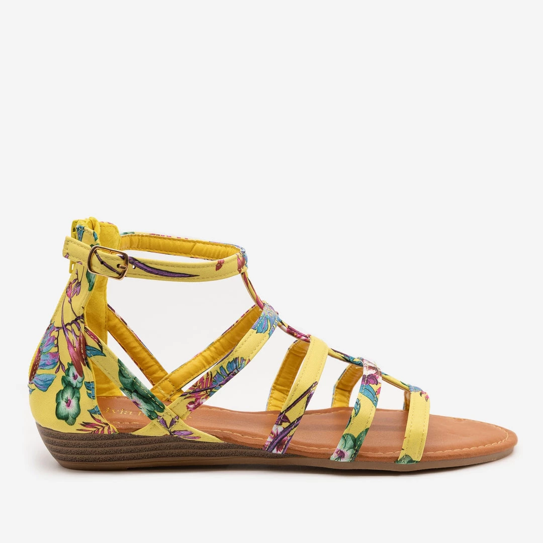 Add a gorgeous floral touch to any look with these adorable Olivia Miller Shoes OMH-9902 sandals! Designed with faux leather, these beauties feature a low stacked wedge heel, an open toe and a strappy gladiator-inspired caged style. The strappy body features a colorful floral print on a bold yellow background, perfect for adding a splash of style to any look! A back ankle zipper lets you slip these sandals on and off with ease and an ankle buckle lets you adjust for the perfect fit. Pair these sandals with cuffed skinny jeans, a solid colored tee and a boxy jacket for a super cute everyday look! Made with all man-made/vegan materials and runs true to size.