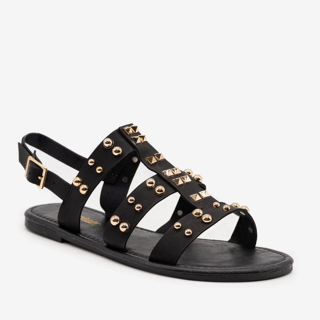 For an edgy summer look, grab a pair of these studded Olivia Miller Shoes OMO-1006 sandals! Designed with faux leather, these sandals feature a flat heel and a triple band and t-strap body with an open toe. A slingback ankle strap adds extra support and clasps with an adjustable buckle. Metallic silver or gold studs add some edge to these stylish sandals! Pair them with distressed black skinny jeans, a belt and an old band tee for a cute, semi grungy look! Made with all man-made/vegan materials and runs true to size.