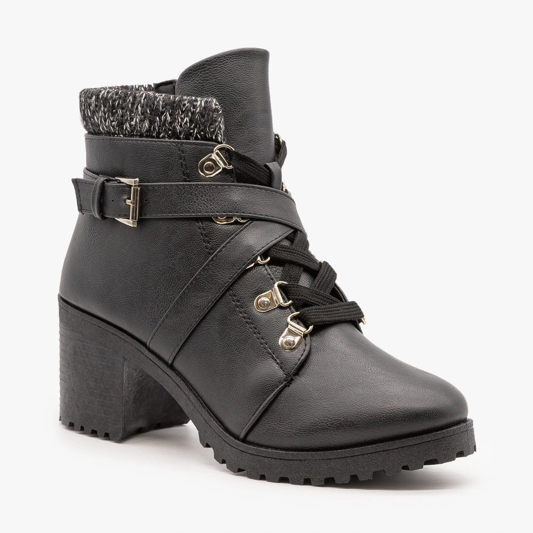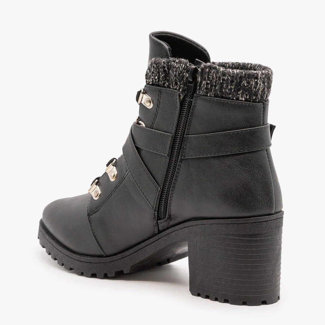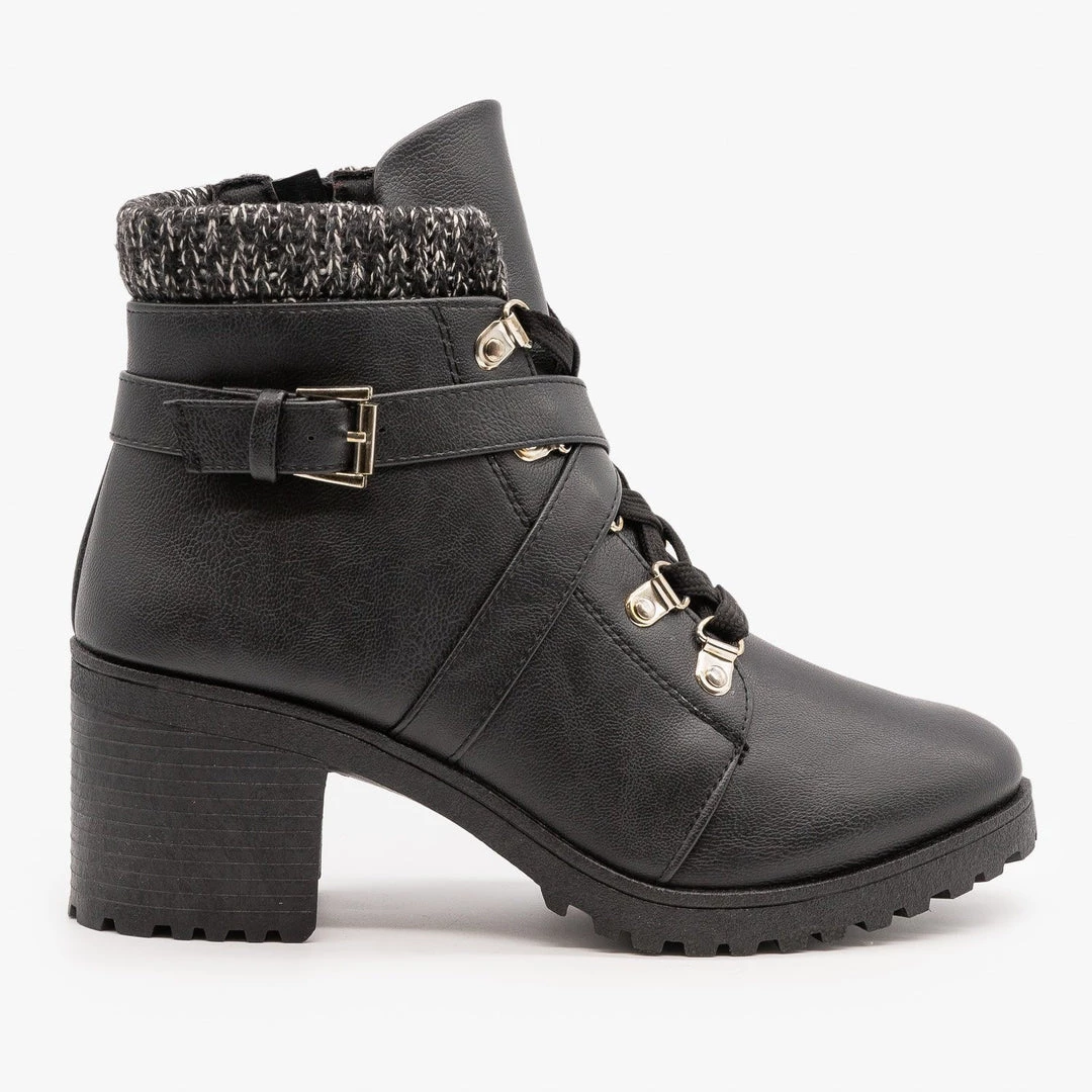We’re obsessed with these cozy Qupid Shoes Timothy-15AX booties! Crafted with faux leather, these booties feature a chic rounded toe and an approx. 2.75″ chunky heel that gives you some height without sacrificing comfort. These booties lace up the front and have a cozy sweater knit cuff. To finish the look, a decorative belt crosses over the entire shoe and buckles on the side. Slip these booties on and off using the full-length inner side zipper. Style these booties with black skinny jeans, a monochrome knit sweater and some simple jewelry for a modern winter look! Made with all man-made/vegan materials and runs true to size.