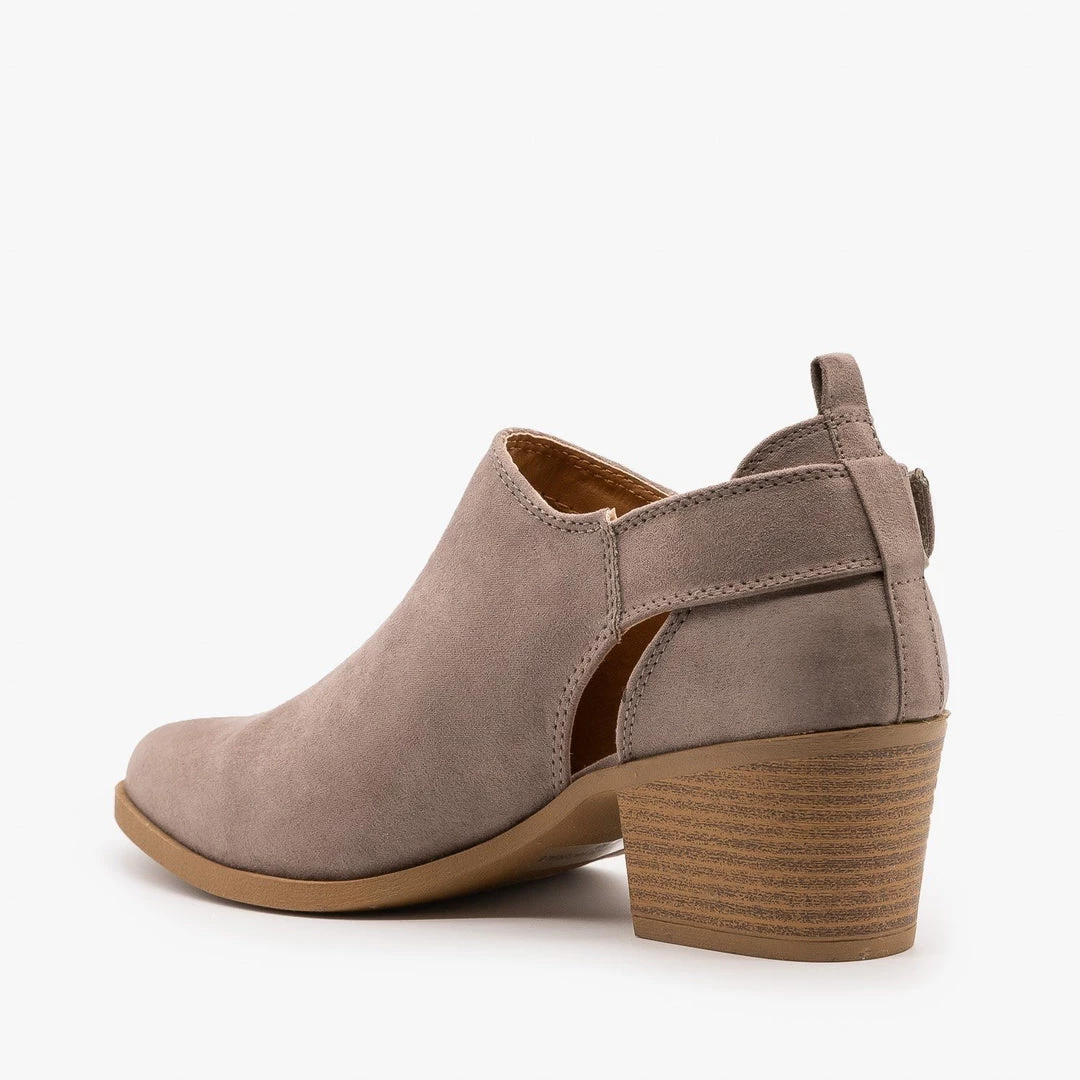 Stay cute and comfy in these super cute Qupid Shoes Rover-26 booties! Crafted from faux suede, these booties feature a posh lightly burnished, almond shaped toe and an approx. 2″ stacked block heel that gives you just a little height but remains easy to walk in. The back of this bootie has a support area for the heel and a slingback style band with an adjustable clasp, leaving cute cut out areas on the side of the foot, making them a little more unique! Pair these booties with narrow legged pants, a tucked in button up and a cute blazer for a classy fall look! Made with all man-made/vegan materials and runs true to size.