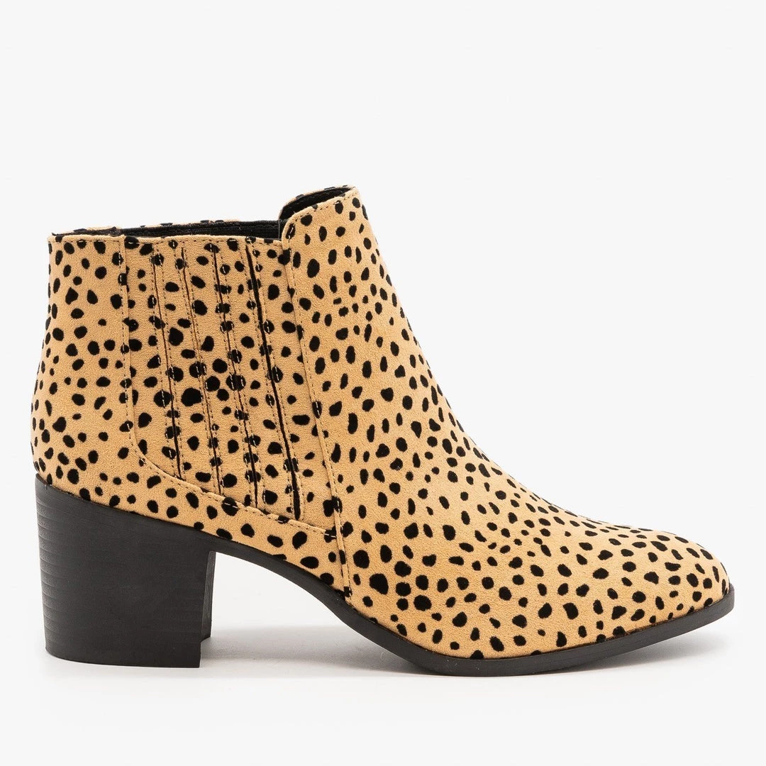 Leave your worries in the dust in these cheetah print Qupid Shoes Topanga-01 ankle booties! Crafted with faux suede, these booties feature a trendy cheetah print, stylish almond shaped toe and a 2.5″ chunky heel that adds just the perfect amount of height. The sides feature a cleverly disguised elastic panel that allows you to slip these booties on and off with ease. Pair them with black skinny jeans, a light sweater and a utility jacket for a functional yet stylish everyday look! Made with all man-made/vegan materials and runs true to size.Â