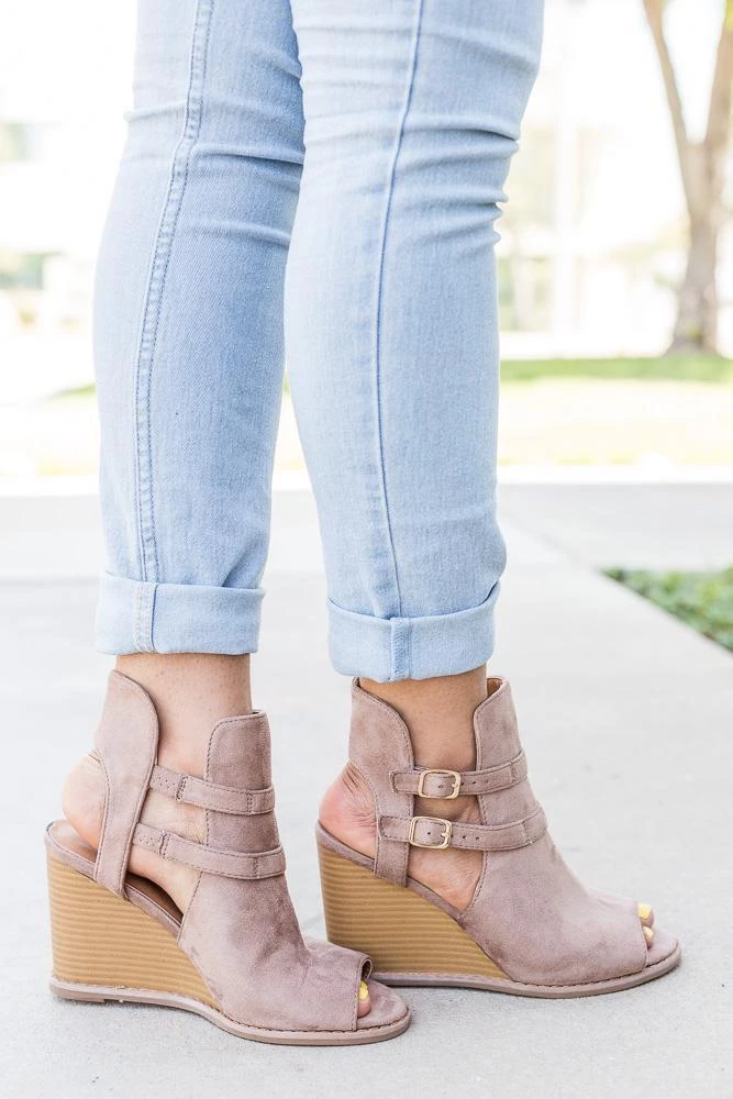 Step into a pair of these Qupid Shoes Finley-02 peep-toe wedges for the cutest finishing touch to any outfit! Crafted out of faux suede, these wedges feature an adorable peep-toe design and adjustable buckled ankle straps for easy on/off access. The cutout design gives these shoes an edgy look while the 3.5″ stacked wooden wedge gives these shoes some height and a sassy look. You can wear these wedges with a basic casual bodycon dress and an oversized denim jacket for the perfect “casual, but sexy” going-out look! Made with all man-made/vegan materials.