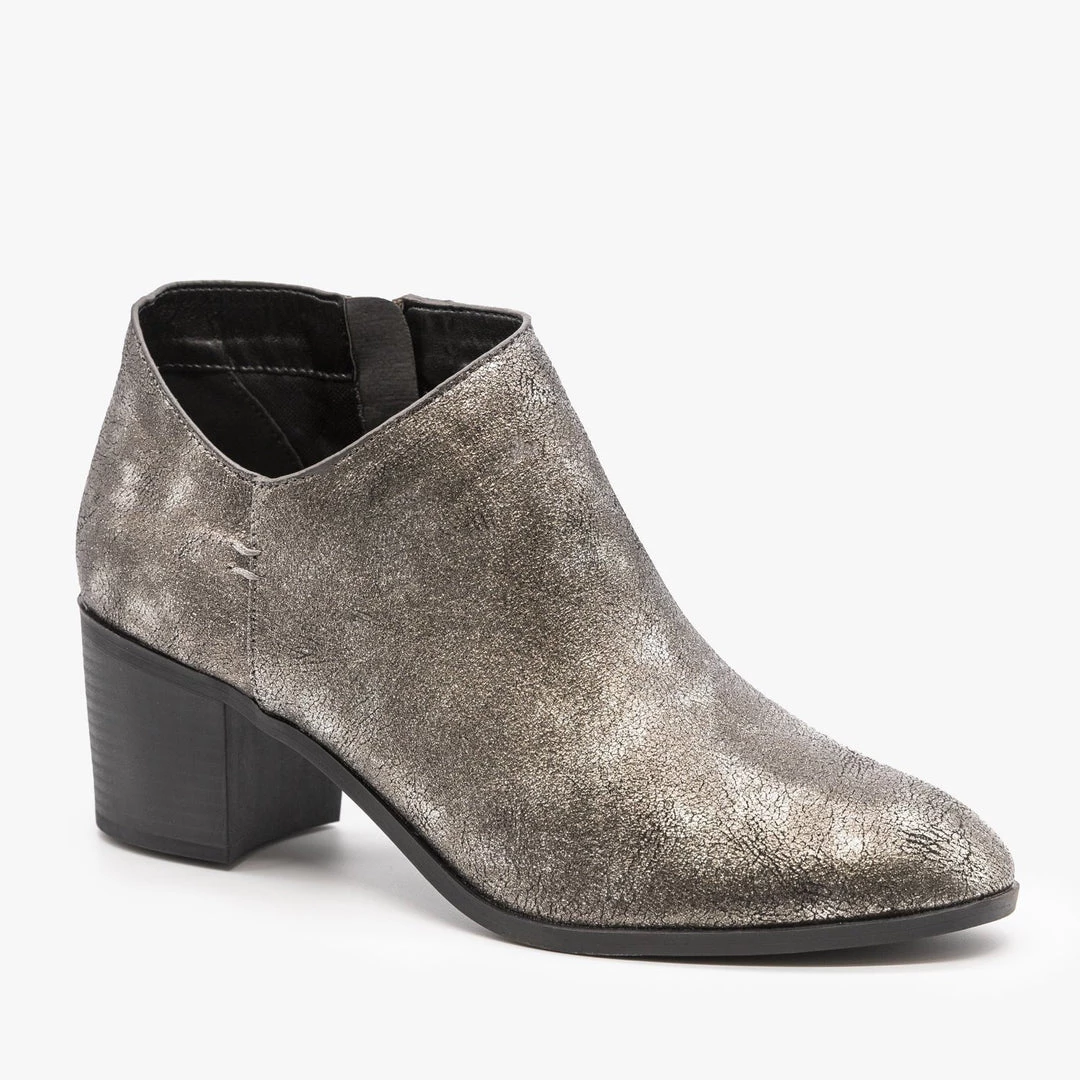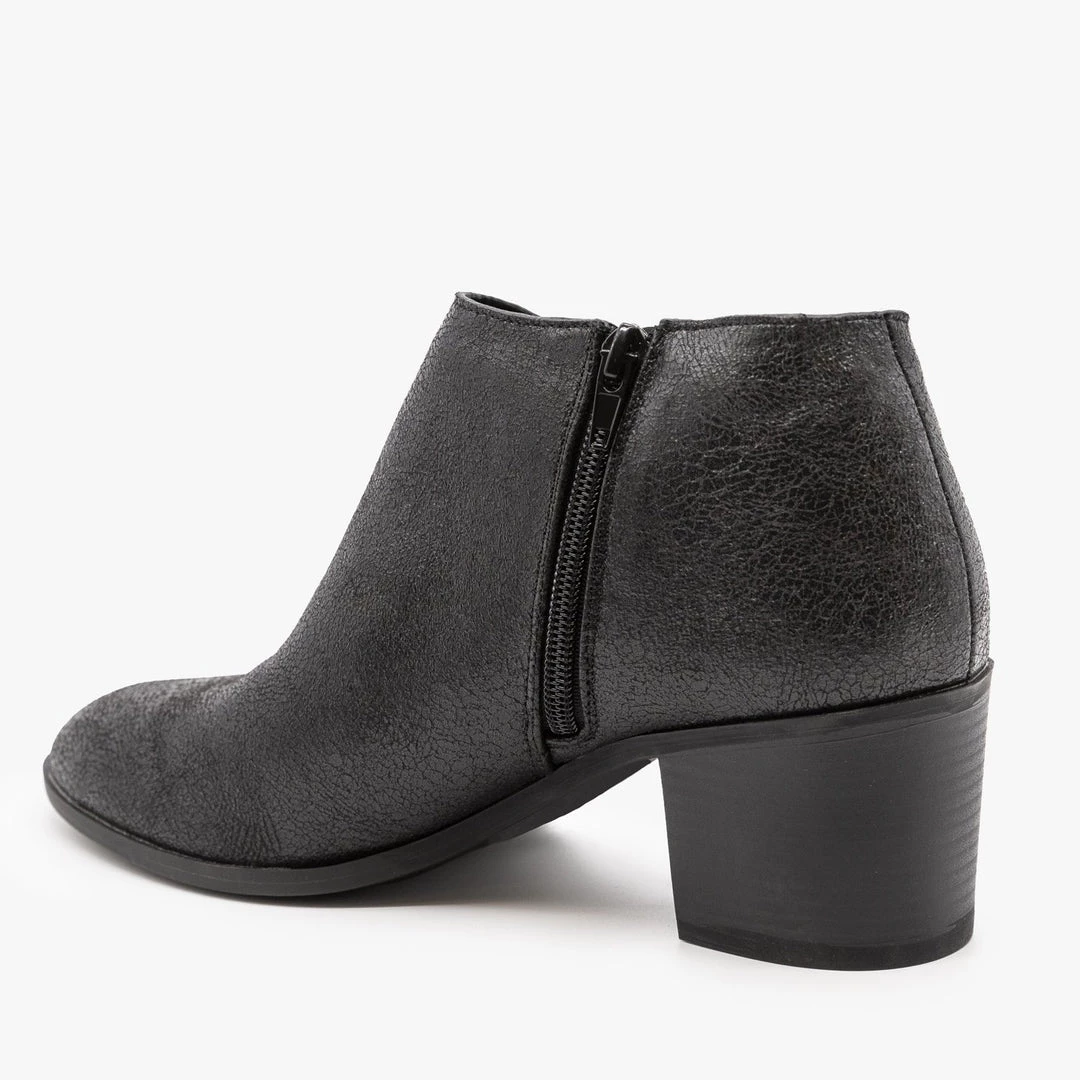 Shine bright like a diamond with these Qupid Shoes Topanga-20 metallic ankle booties! Beautifully crafted out of faux metallic leather, these booties feature an edgy distressed design and an interior side zipper for functionality and ease. These booties also feature a classy almond-shaped toe and a 3″ block heel for extra style and sass. Pair these booties with some distressed raw hem jeans and a knotted basic tank for the ultimate casual cool look! Made with all man-made/vegan materials.