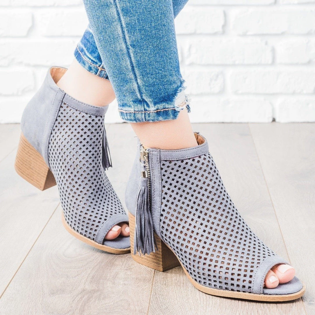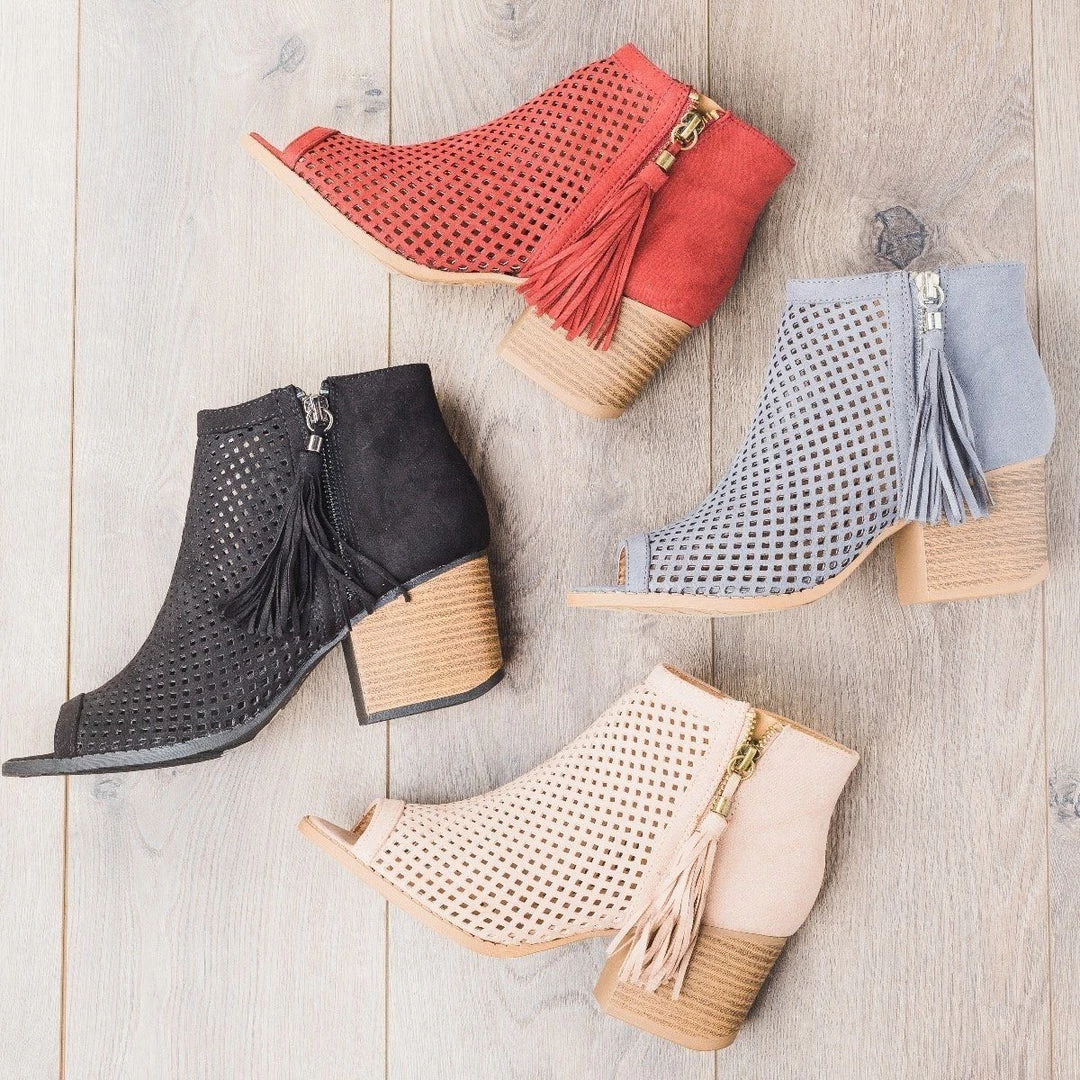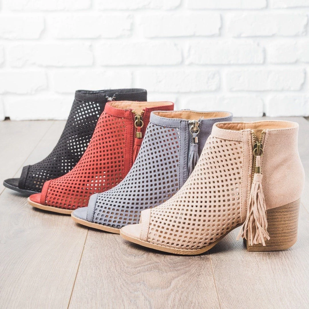 Life is a cake walk in the Qupid Shoes Core-18 booties! These multi-seasonal booties are beautifully crafted out of faux suede materials and feature a trendy open-toe style. These gorgeous shoes also feature a laser-cut mesh design and an adorable exterior side zipper tassel pull. The stacked block heel is ~2.5″, giving you just the right amount of height to wear these all day long! Wear these edgy and cutie booties with a pair of raw hem ankle jeans and an off-the-shoulder top for a stylish and laid-back outfit that is right on trend! You can wear these shoes to any party or social gathering, or just to run your everyday errands! Made with all man-made/vegan materials and fits true to size.