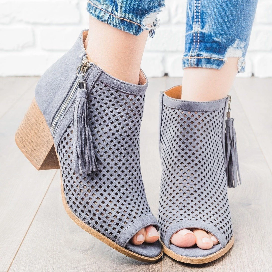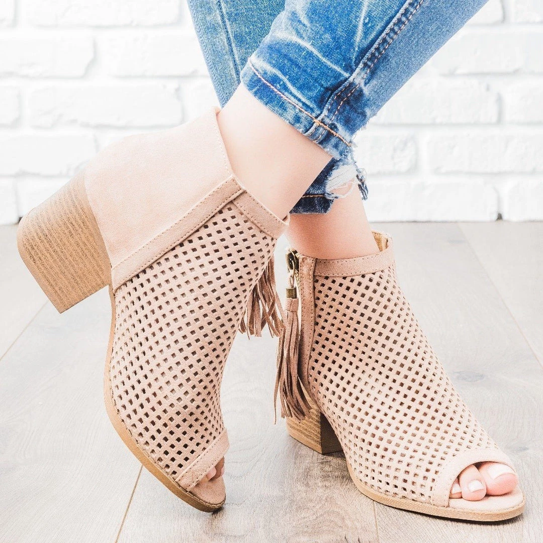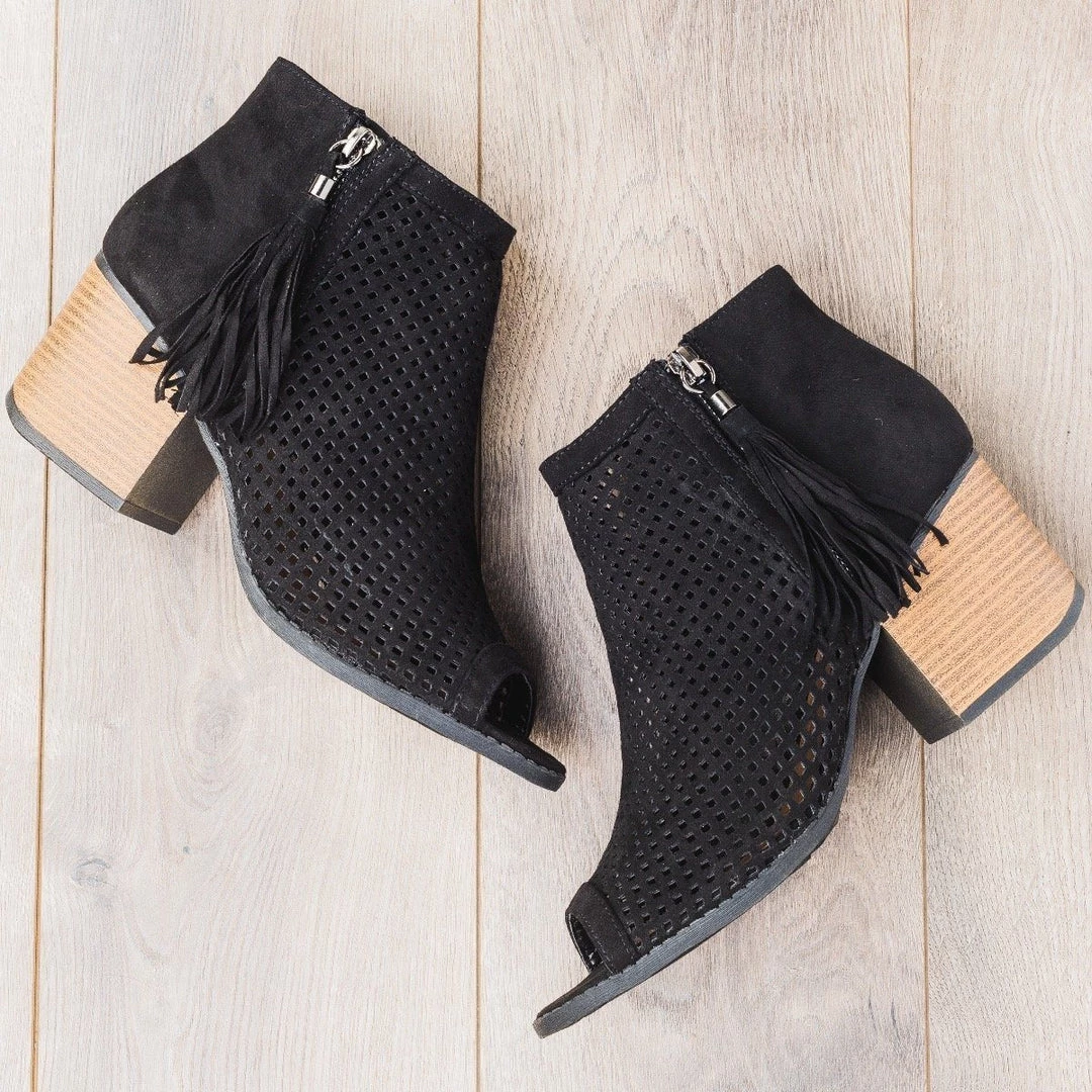 Life is a cake walk in the Qupid Shoes Core-18 booties! These multi-seasonal booties are beautifully crafted out of faux suede materials and feature a trendy open-toe style. These gorgeous shoes also feature a laser-cut mesh design and an adorable exterior side zipper tassel pull. The stacked block heel is ~2.5″, giving you just the right amount of height to wear these all day long! Wear these edgy and cutie booties with a pair of raw hem ankle jeans and an off-the-shoulder top for a stylish and laid-back outfit that is right on trend! You can wear these shoes to any party or social gathering, or just to run your everyday errands! Made with all man-made/vegan materials and fits true to size.
