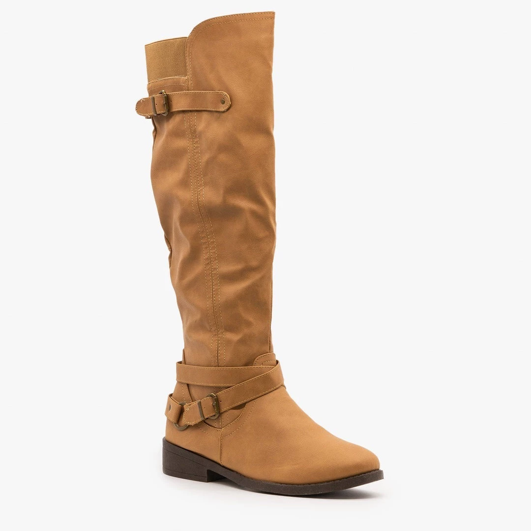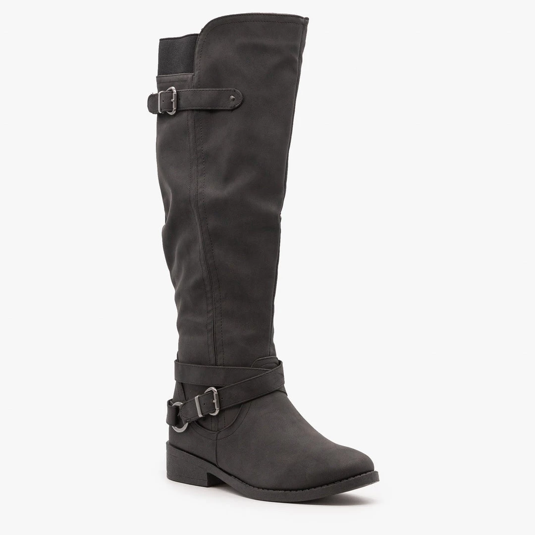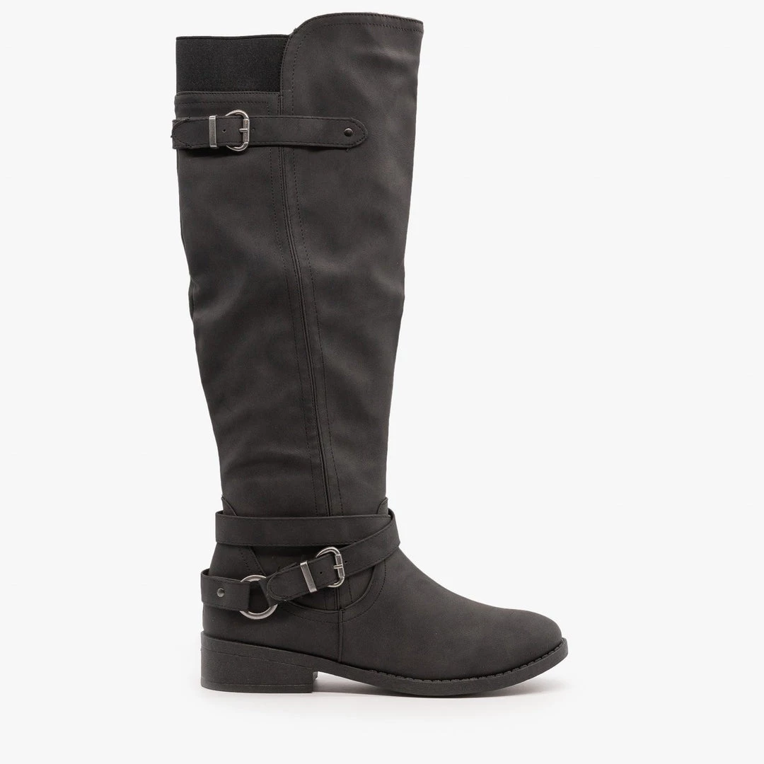 Kick up the dust in these lovely Qupid Shoes Plateau-175BX riding boots! Crafted with faux nubuck, these boots feature a low, 1.5″ block heel, a stylish almond shaped toe a full-length inner zipper for easy on/off access. A belt wraps around teh ankle and clasps with a cute loop and buckle and another buckle at the top adds a little more style. These boots rise all the way to the knee and have a slightly taller front than back for a classic western look. A short elastic panel at the top of the boot completes the look and adds a little more flexibility. Pair these boots with dark skinny jeans and a cozy flannel for an unbeatable fall or winter look! Made with all man-made/vegan materials and runs true to size.