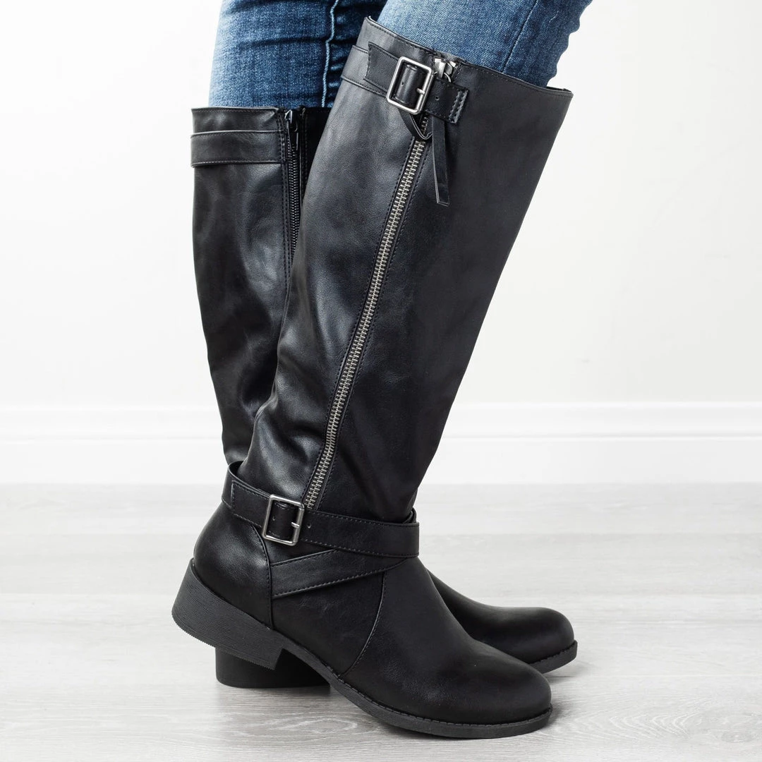 Take each day one step at a time with the Qupid Shoes Plateau-291 riding boots! Beautifully crafted out of faux leather, these gorgeous boots go to just about mid-calf and feature a 1″ block heel. These boots also feature an interior side zipper for practicality and a rounded toe, making them great to wear all day long. The exterior side zipper adds some extra style and edge to these already fashionable boots. Finishing off these boots is a criss cross belted buckle design that goes across the bottom part of the boot and another belted buckle accent at the back of the top of the boot. You can wear these boots with your favorite pair of leggings and a button-up chambray top for the ultimate fall outfit! Made with all man-made/vegan materials.