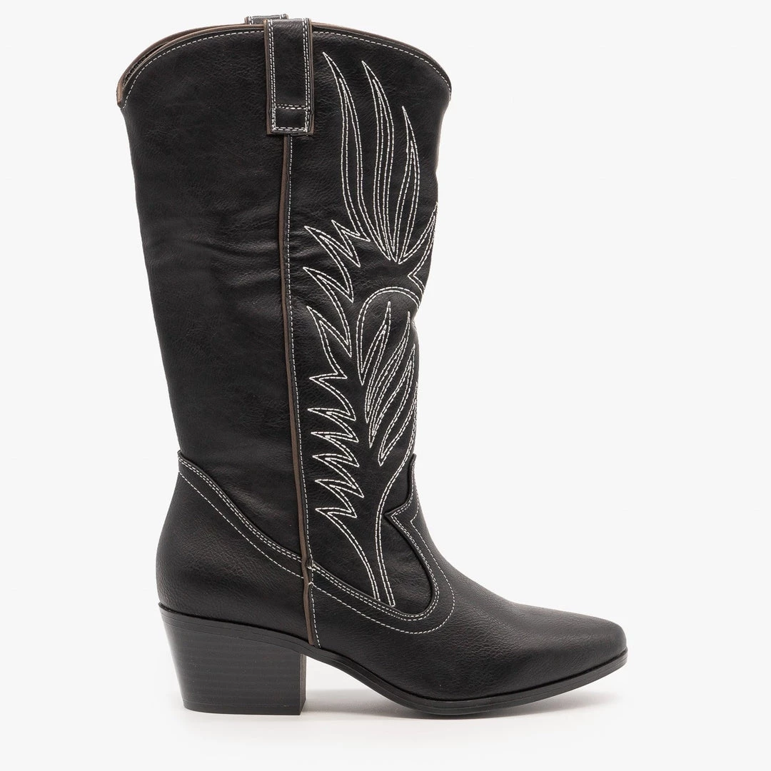 Take a ride through the wild, wild West in these Qupid Shoes Montana-18 cowboy boots! Crafted with faux leather, these boots feature an approx. 2″ chunky heel, stylish almond toe and rise to the mid-calf for the perfect western silhouette. The body features gorgeous classic embroidery to complete that cowboy boot look! Pair these boots with anything from a summer dress to distressed denim shorts and a cropped tee! Made with all man-made/vegan materials and runs true to size.