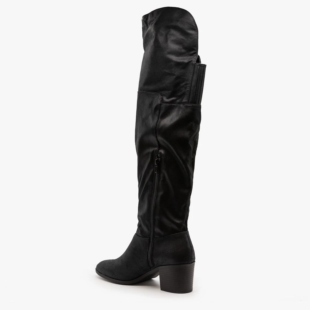 Embrace your inner diva with these fabulous Qupid Shoes Topanga-74 knee high riding boots! These beauties are crafted from faux leather and feature an almond shaped toe and an approx. 2.5″ stacked block heel that adds the perfect amount of sass. The entire body of the boot rises nearly to the knee and the front of the boot rises all the way up. The slightly distressed leather completes this look! Style these booties with a bodycon dress, a cropped jacket and a bedazzled clutch for a night out with your girls! Made from all man-made/vegan material and runs true to size.