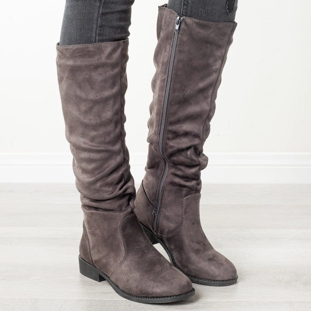 These boots were made for walkin,’ and that’s just what they’ll do! Step into these Qupid Shoes Zion-04BX boots, and you’ll be strutting your stuff all over the place! These beautiful fall essential boots are made out of faux suede and come up to just above mid-calf. The interior side zipper allows for easy on/off access, while the 1″ heel and rounded toe make it comfortable enough for you to wear these boots all day long. The slouchy style also gives these boots a super trendy and timeless look. You can wear these boots with just about anything! Pair them with some leggings, a knotted graphic tee, and a cozy flannel for the perfect fall outfit! Wear them with an overall dress and a long-sleeved turtleneck top for a look that is great for a cool, but sunny day! Made with all man-made/vegan materials.