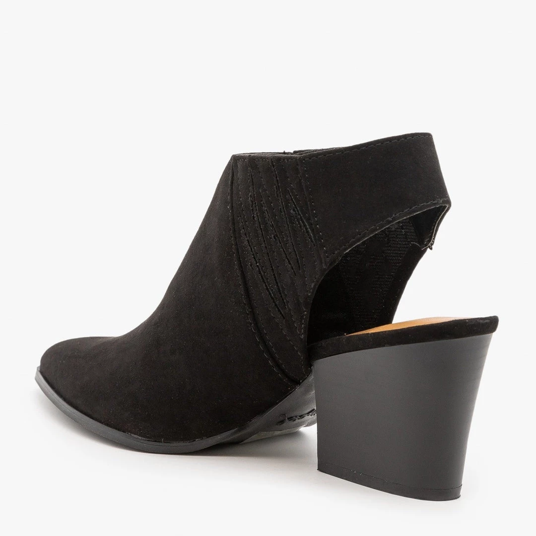 Look like you stepped right off the runway in these chic Qupid Shoes Nava-37A mules! Crafted with soft faux suede, these beauties feature a stylish pointed toe and an approx. 3″ faux wood chunky heel that looks super modern and minimalist. The slingback ankle strap is lined in elastic and features a unique side cut design that looks great and adds enough flexibility to the strap that you can slip these heels on and off with ease. These beautiful heels look amazing with any outfit! Try pairing them with distressed denim overalls for a fun country-chic look or style them with fitted ankle length pants and a cute blouse for a stellar business casual look! Made with all man-made/vegan materials and runs true to size.