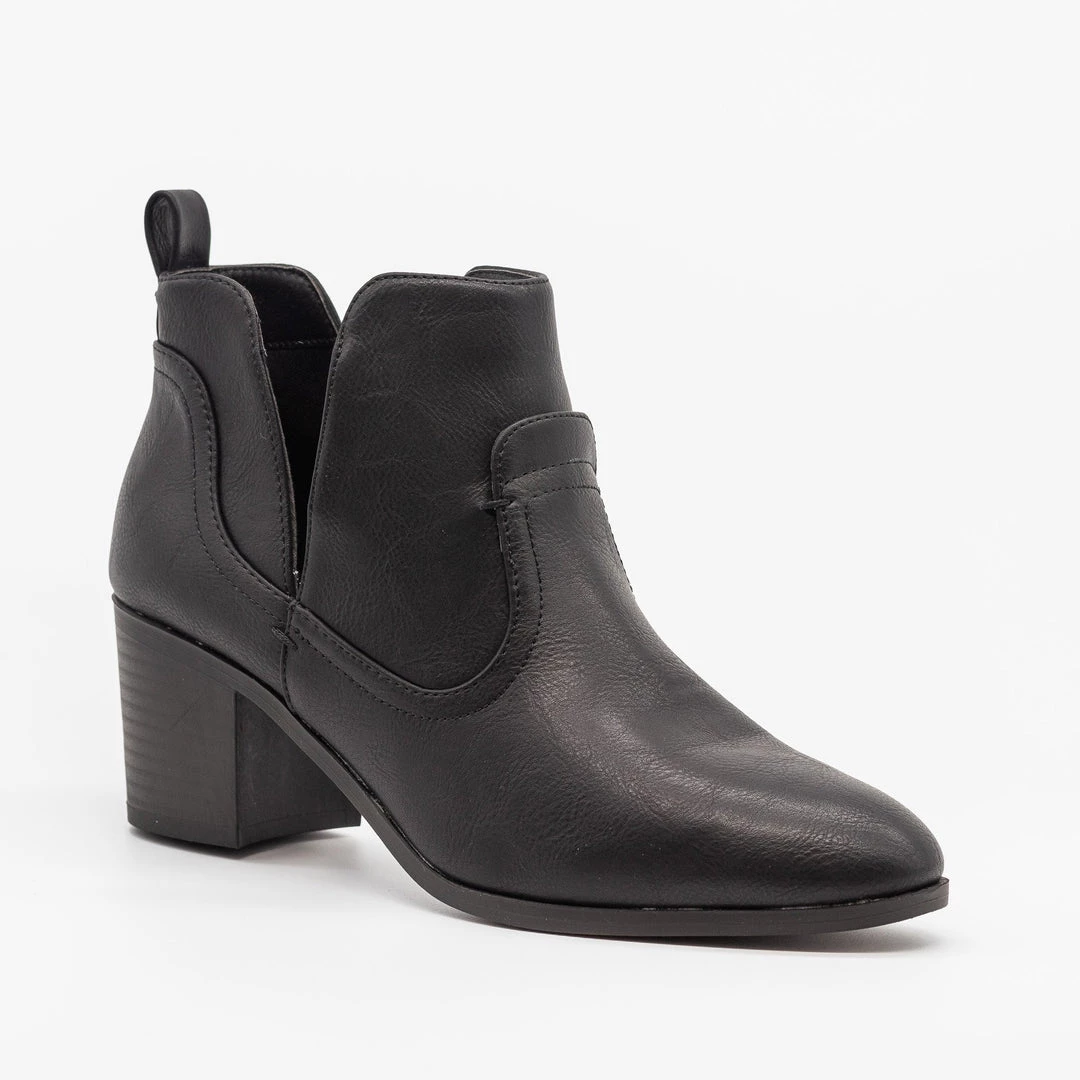 Say hello to these super cute Qupid Shoes Topanga-49 ankle booties! These beautiful booties are made out of faux leather and feature an easy-to-wear slip-on design. The pointed burnished toe design gives these shoes a posh look while the side cutouts add some extra style to these fashionable booties. The 3″ stacked chunky heel is perfect for adding just the right amount of height to these trendy shoes. Pair these booties with some high-waisted ankle jeans and a trumpet-sleeved top for a cute weekend outfit! Made with all man-made/vegan materials.