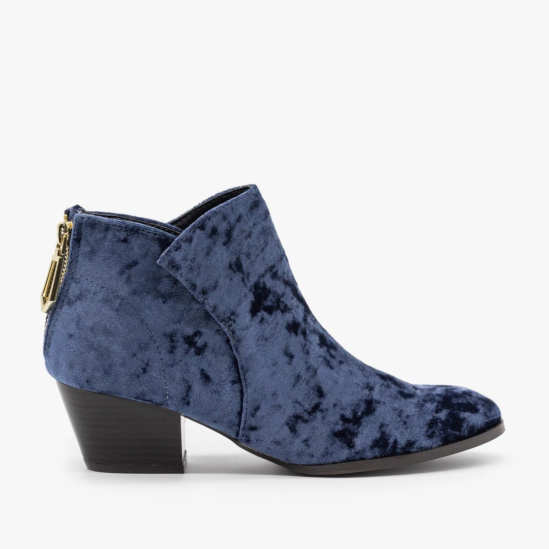 Fall in love with these Qupid Shoes Travis-36 velvet ankle booties! These beautiful booties are made out of a posh velvet material and feature a back ankle zipper for easy on/off access. The 2″ chunky heel also adds a bit of height and edge to these fashionable shoes. The almond-shaped toe design gives these shoes a chic, sophisticated look. Available in different colors, these shoes will go great with a pair of black distressed raw hem ankle jeans and a flowy off-the-shoulder top for a super cute fall outfit! You can even wear these booties with a button-up spaghetti strap midi dress for an adorable summertime look! Made with all man-made/vegan materials.