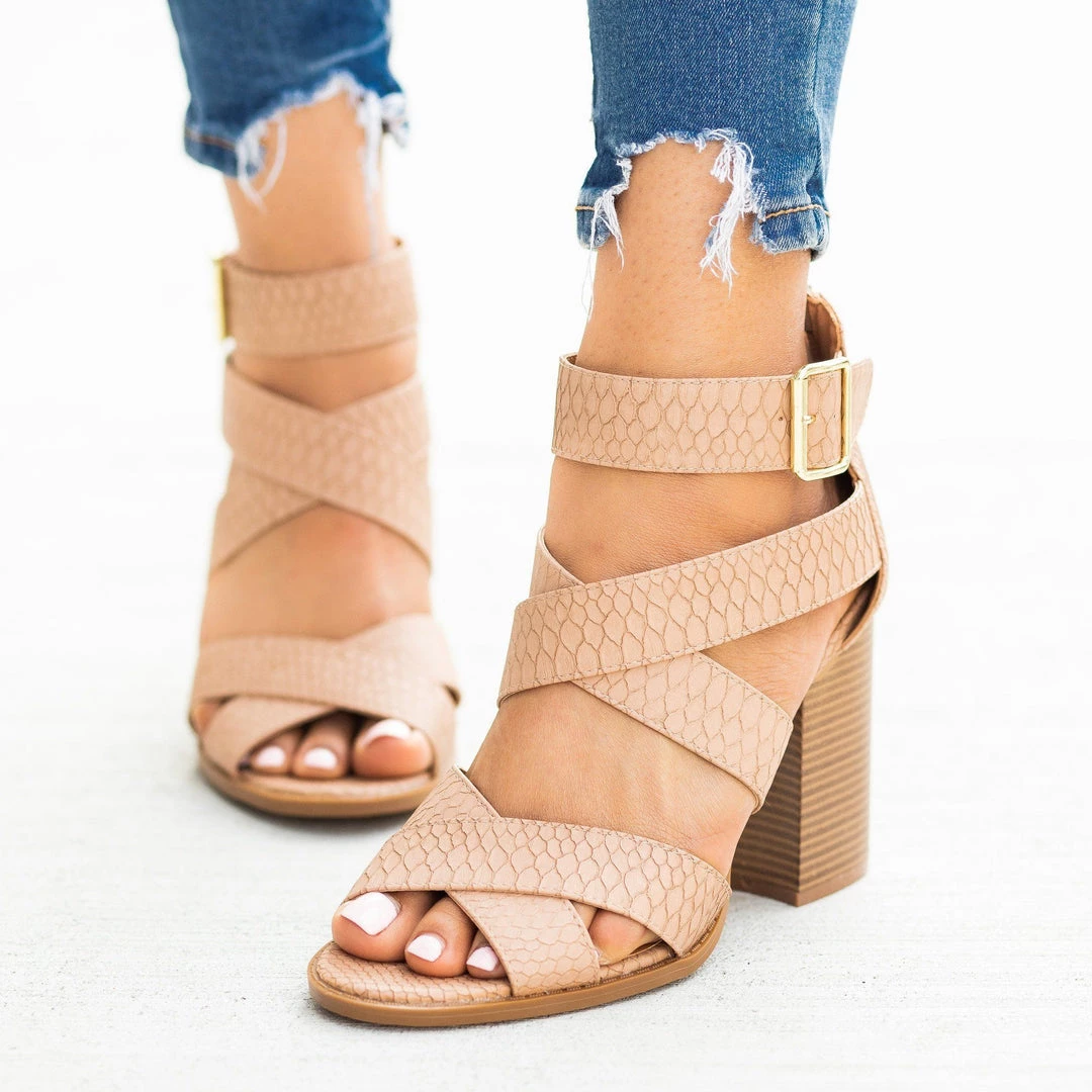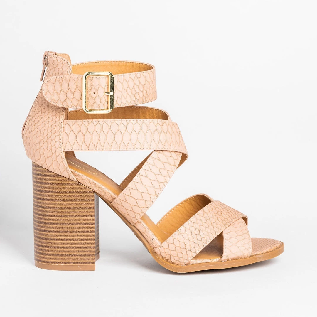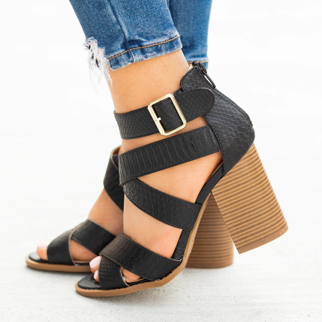 Strut your stuff in style with these Qupid Shoes Brammer-71 high heels! Beautifully crafted out of faux leather, these heels feature a trendy open-toe style and a strappy criss cross design for extra sass. The buckled top strap gives these shoes some extra edge, while the 4″ stacked chunky heel gives these shoes some height and a fashionable look. The back ankle zipper also provides easy on/off access. Pair these heels with some dark wash high-waisted ankle jeans and a cropped tank for a cute and trendy fashionable look! Made with all man-made/vegan materials.
