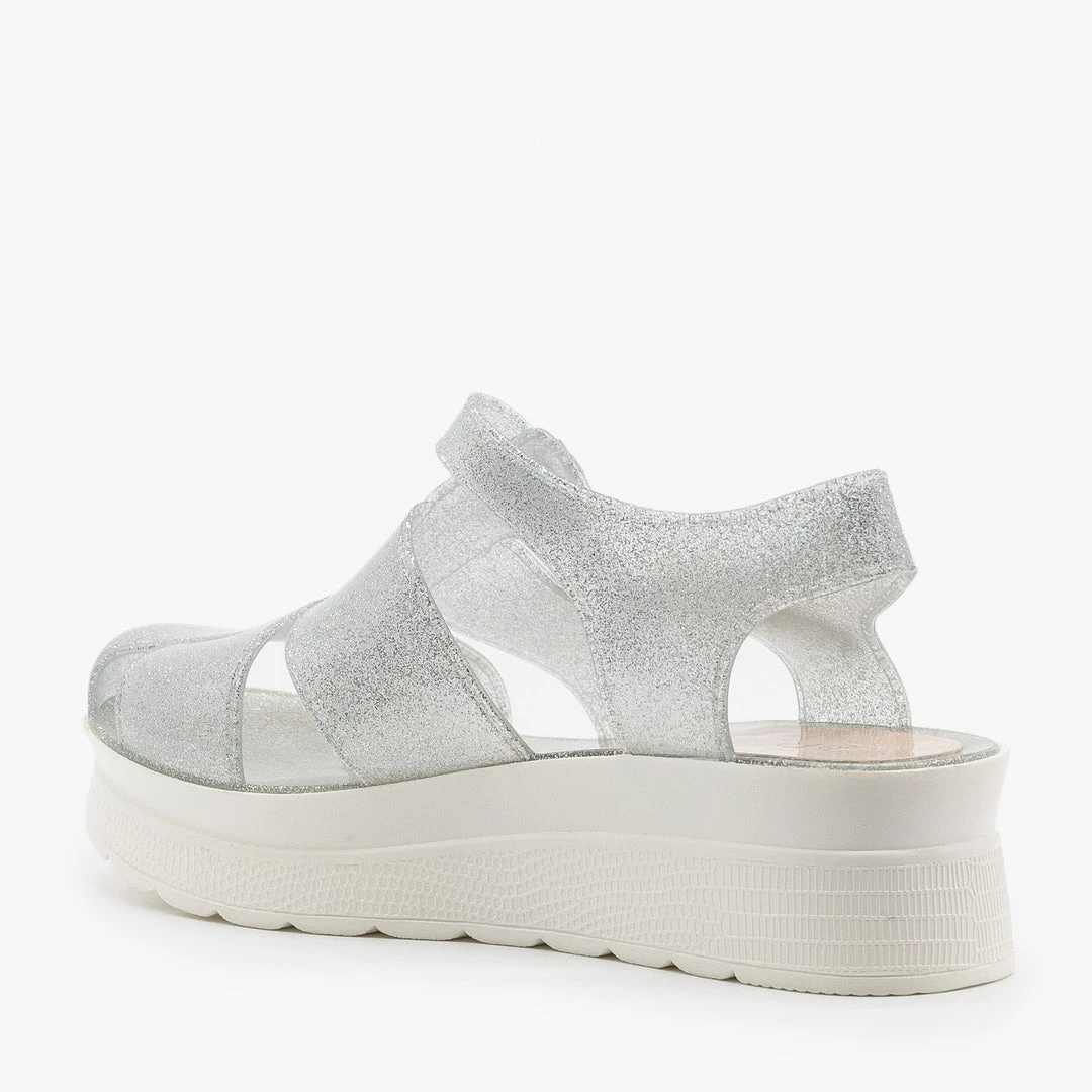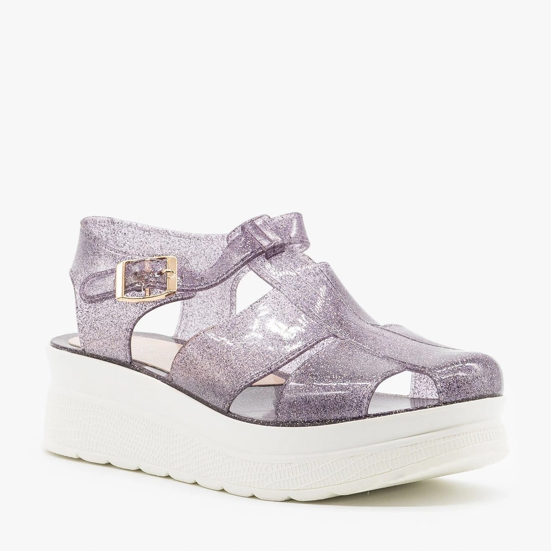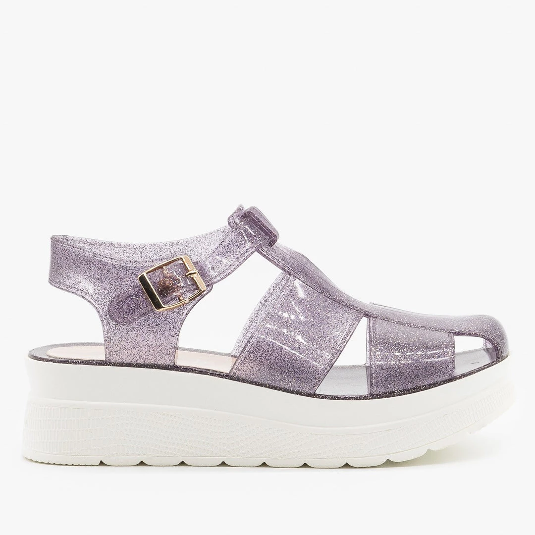 Make a fashion statement with these adorable Refresh Shoes Fonda-02 jelly platform sandals! Made out of glitter jelly plastic material, these sandals feature an adjustable ankle strap for easy on/off access and a ridged rubber sole for extra support and comfort. The rounded closed-toe design gives these shoes a retro look, while the side cutouts add some extra edge. Pair these shoes with a denim jumper dress and a basic cropped top for a truly 90’s-inspired look! Made with all man-made/vegan materials.