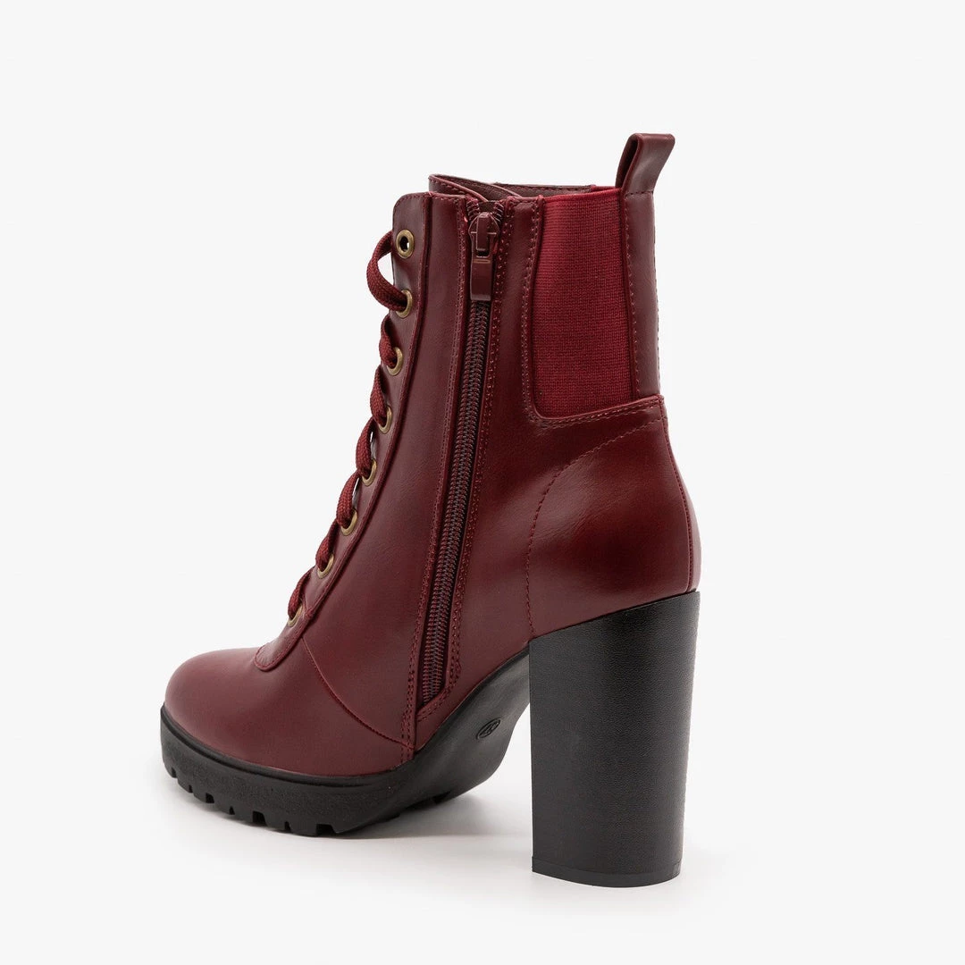 We don’t believe in treading lightly– stomp it out in the Refresh Shoes Maxi-01 booties! Crafted with faux leather, these booties feature a poppin’ 4″ chunky heel that will have you walking the walk all day long. The lace-up front and treaded bottom sole give it the classic combat boot look. An elastic back panel gives it a comfortable stretchiness, and the inner zipper and pull tab are included for easy entry. Combine with a t-shirt dress and oversized denim jacket, and accessorize with bold sunnies for an edgy, fun vibe.  Made with all man-made/vegan materials and runs true to size.