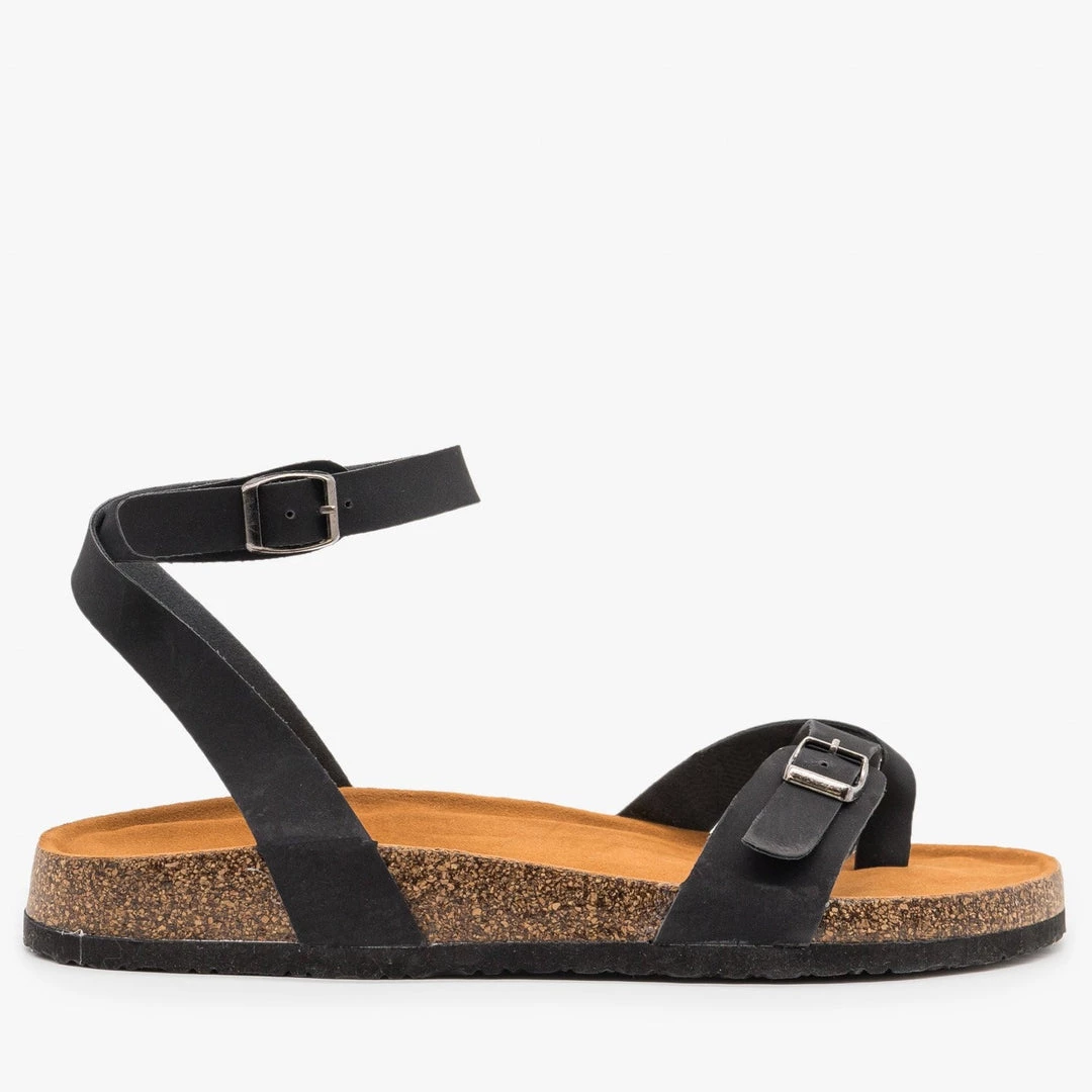 Walk on air in these Refresh Shoes Leo-21 sandals! Crafted out of faux nubuck, these sandals feature a cork sole and cushioned insoles for maximum support and comfort. The adjustable wraparound ankle strap provides easy on/off access while the buckled toe-strap design adds style and extra support. You can wear these sandals with a pair of distressed ankle jeans and a vintage graphic tee for the perfect laid-back look! Made with all man-made/vegan materials.