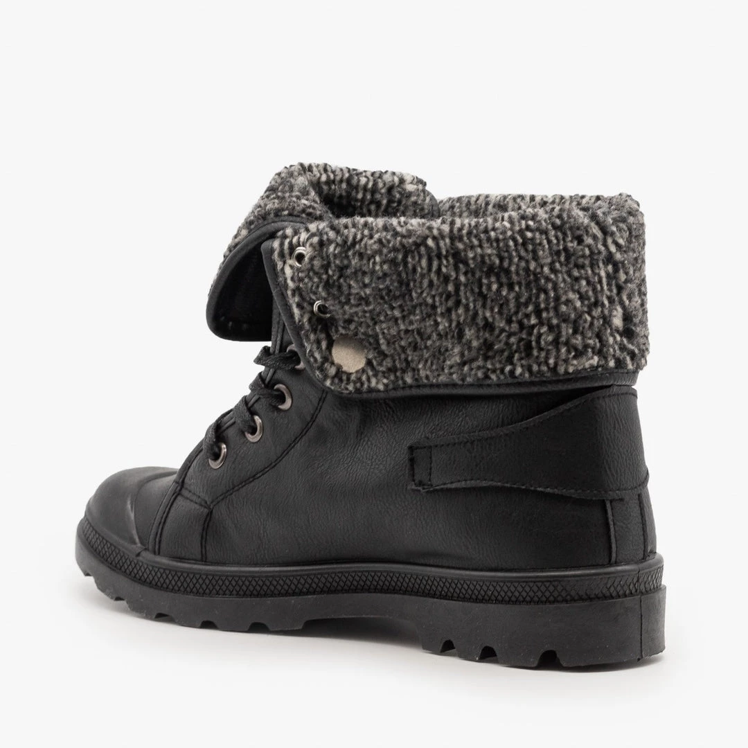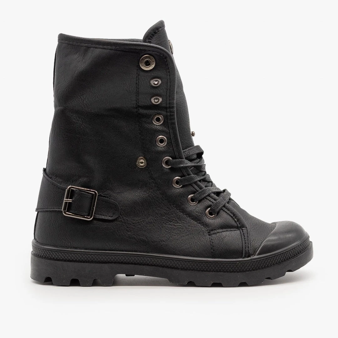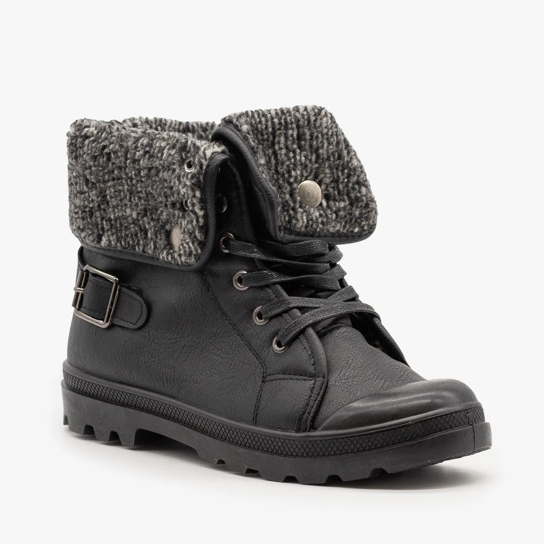 Walk this way in the Refresh Shoes Casper-02 sneaker boots! These adorable sneaker boots are made out of faux leather, and feature a cozy, folded over knit sweater cuff. The trendy lace-up design adds some extra style and sass to these already fashionable shoes. The ridged rubber sole provides extra support, ensuring that you don’t slip and slide. Finishing off these boots is an edgy buckled strap on the back ankle of the shoe. You can wear these boots with a pair of leggings and an oversized denim jacket for the ultimate fall outfit! You can even style these sneaker boots with distressed ankle jeans and a knotted vintage band tee for a cool and casual look! Made with all man-made/vegan materials.