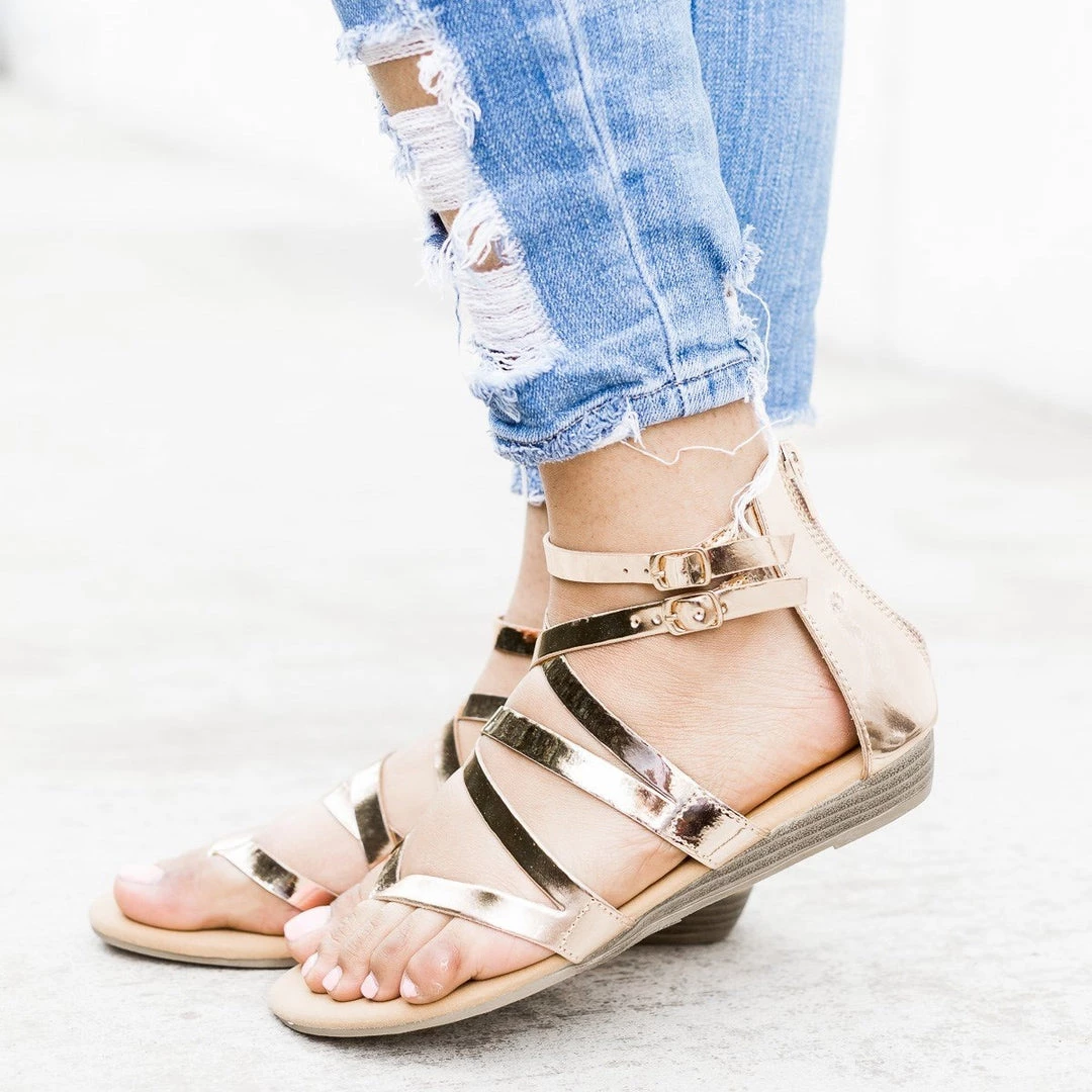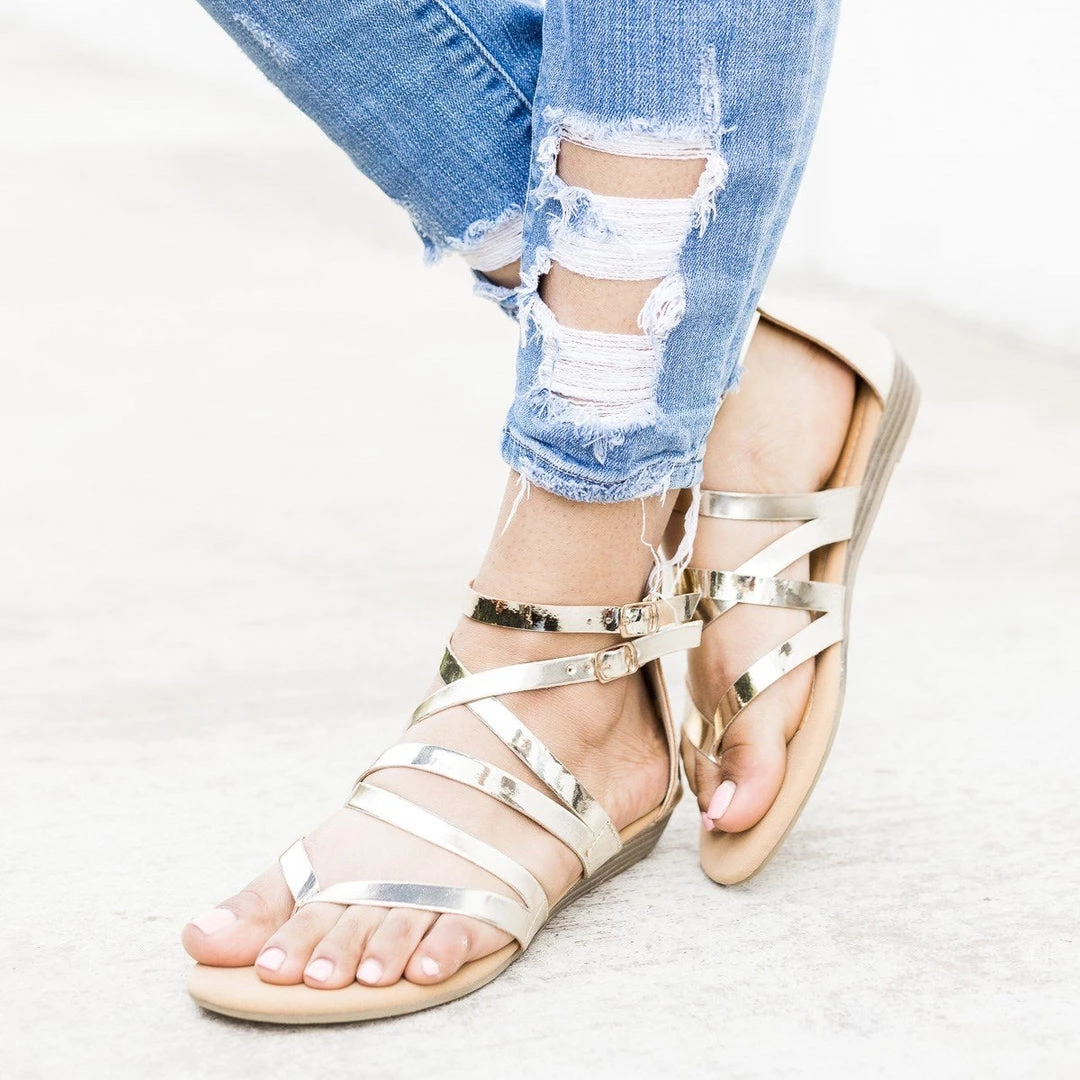 Get glammed up in our Refresh Elsa-01 sandals! These strappy sandals feature a multi, criss-cross strap design that come up to meet the ankle. A functioning zipper is positioned at the back of the foot for easy on and off wear that doesn’t impact the style! they have a thong-toe front leaving the toes open to show off a cute pedicure during the summer. Pair with jean shorts and a camisole for a fun seasonal outfit. Available in matte and chrome color options.Â
