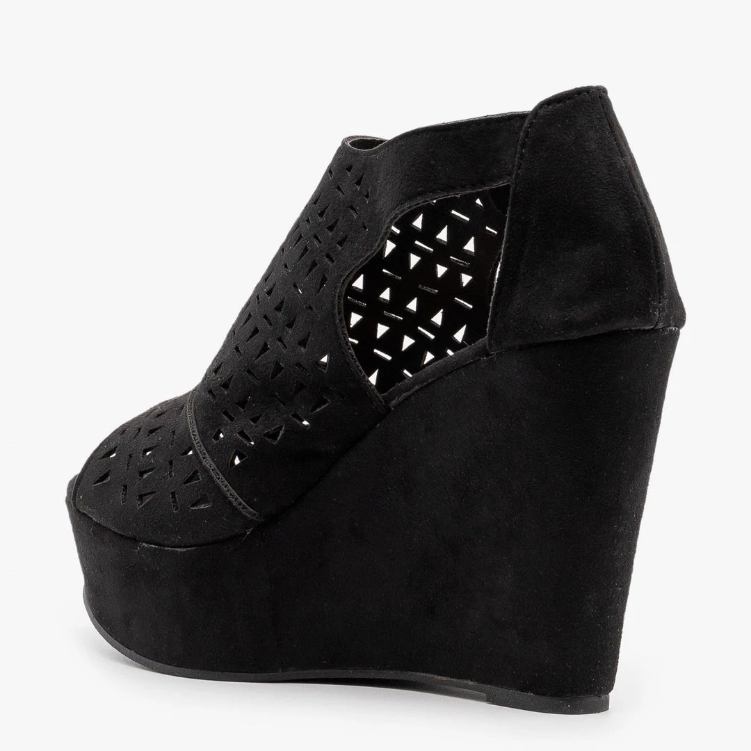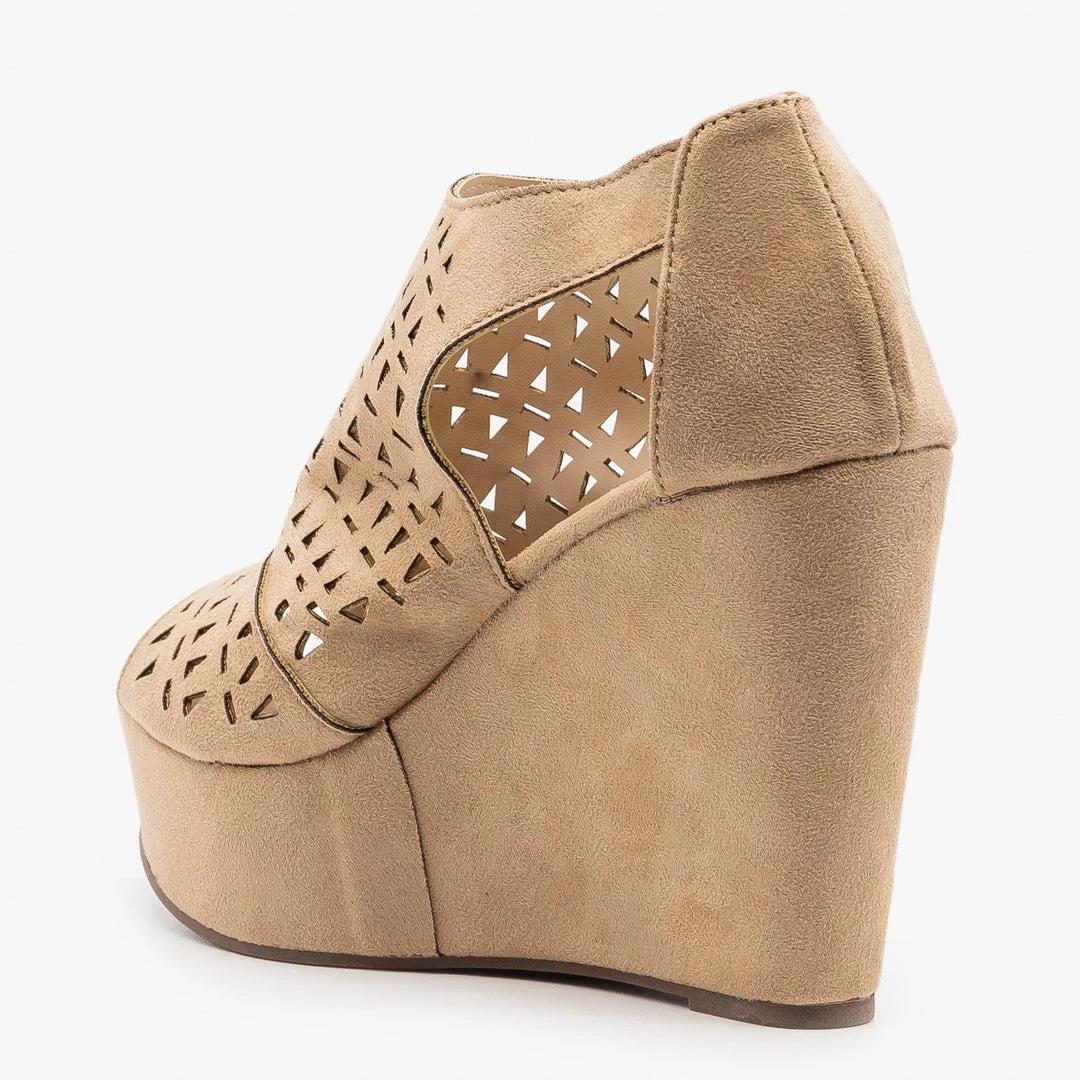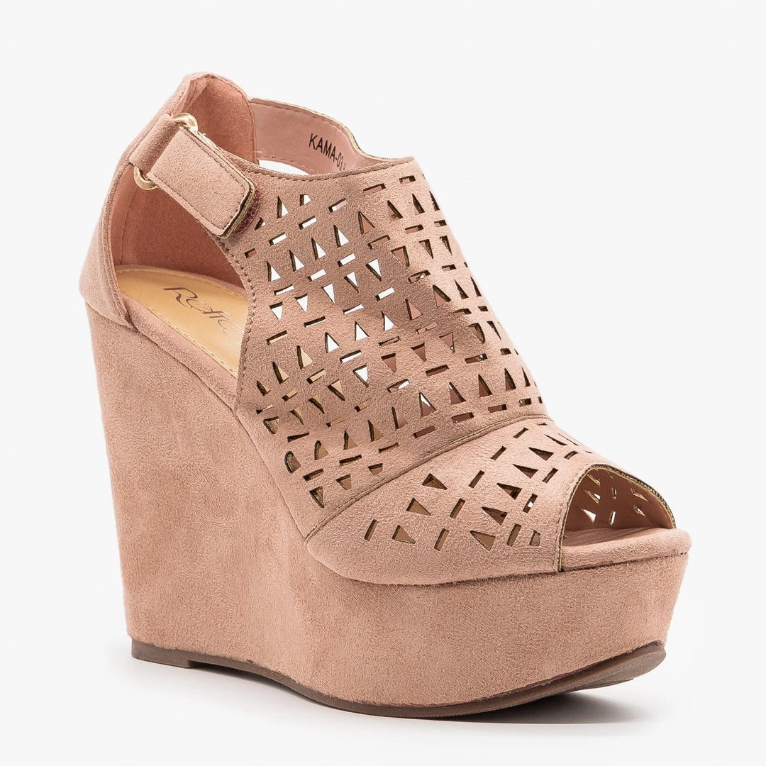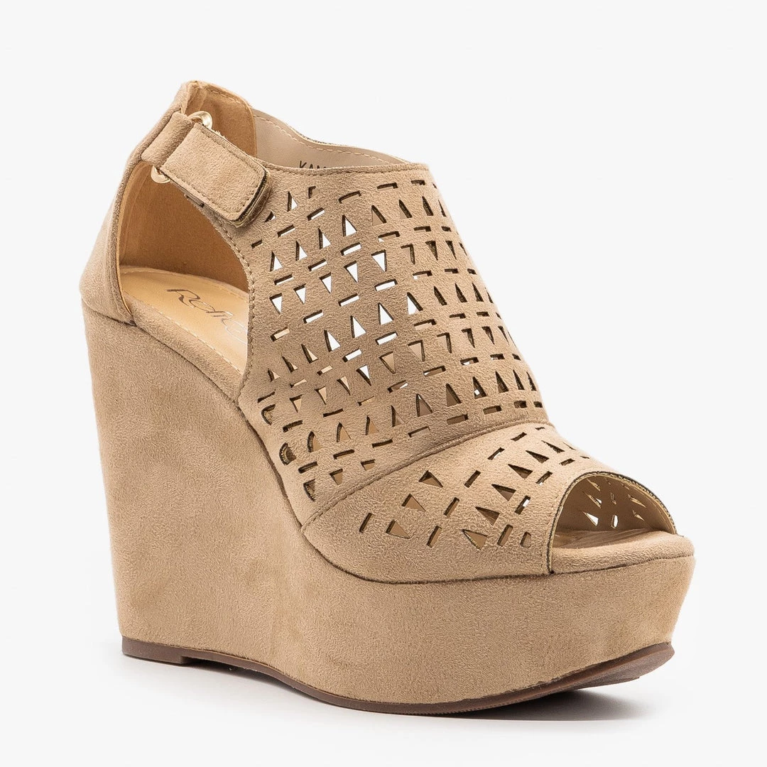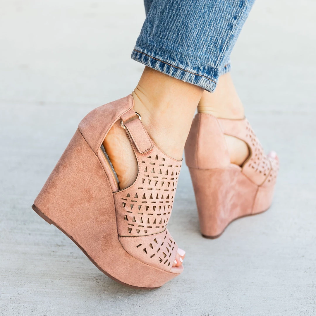 Put your best foot forward with these lovely Refresh Shoes Kama-03 platform wedges! Beautifully crafted out of faux suede, these wedges feature a 4.5″ wedge and a 2″ platform sole. The open-toe design gives these shoes a cute trendy look, while the adjustable velcro ankle strap makes it super easy to put these shoes on and take them off. The gorgeous geometric laser cut design also gives these shoes a fresh, fun look. Pair these wedges with some high-waisted ankle jeans and a basic bodysuit for a fashionable and cute outfit! Made with all man-made/vegan materials.
