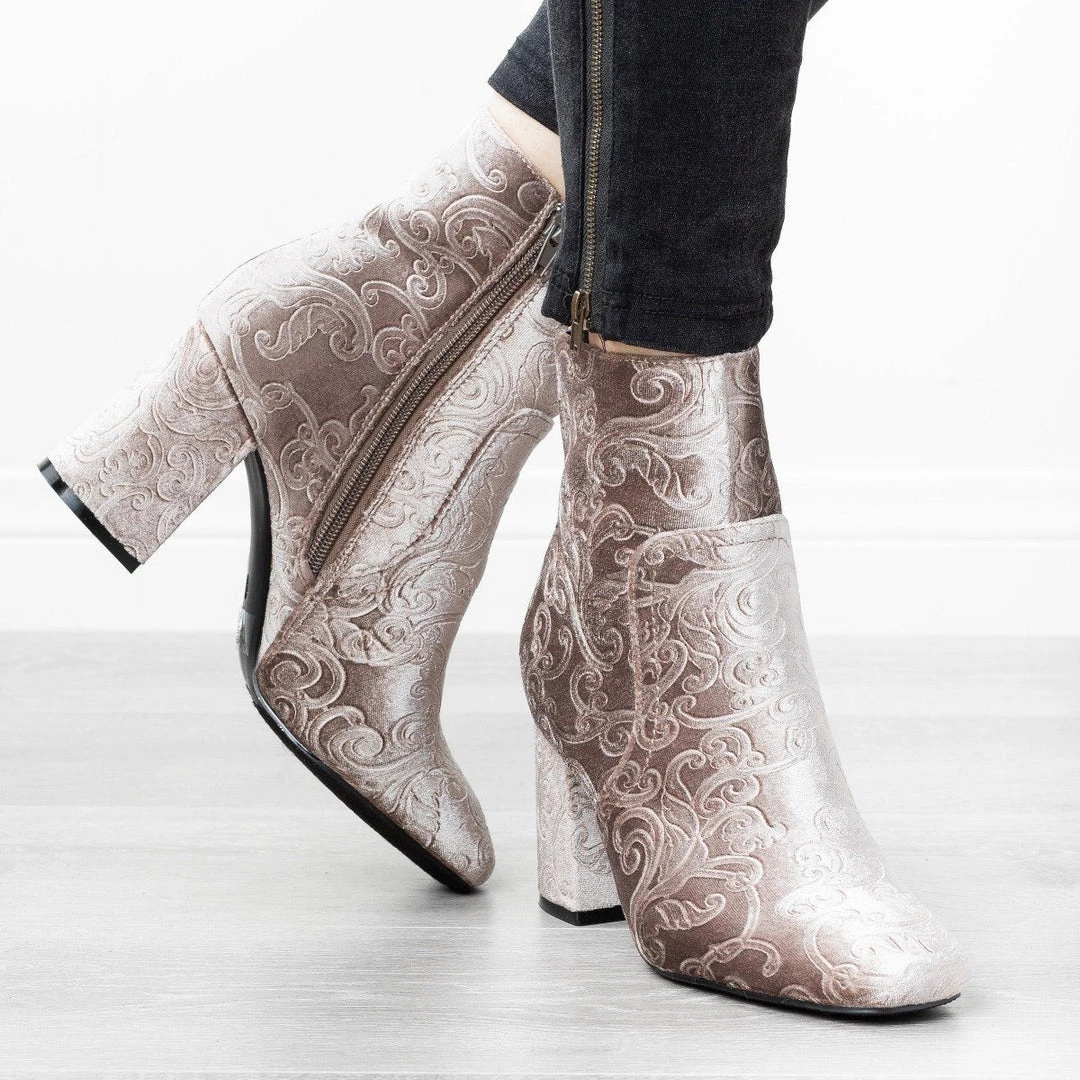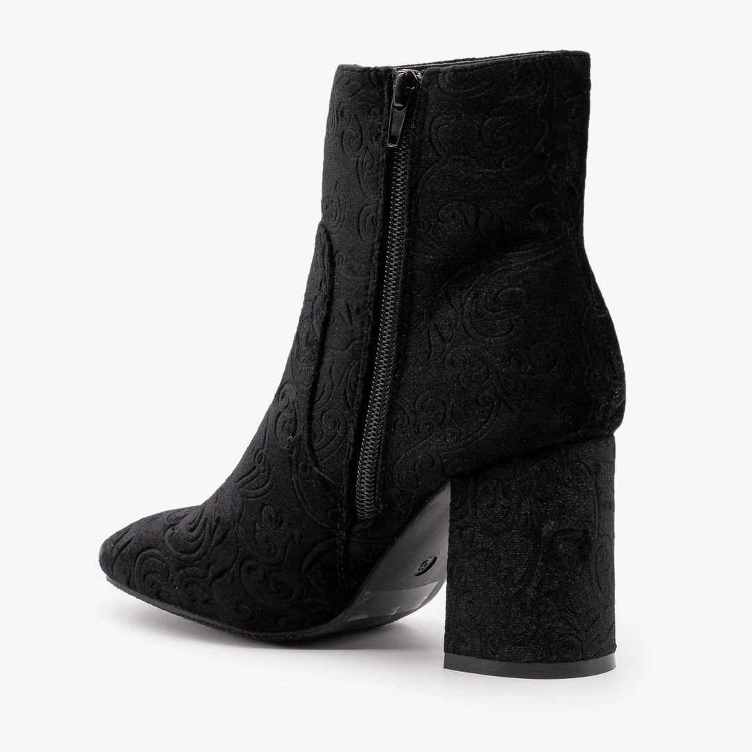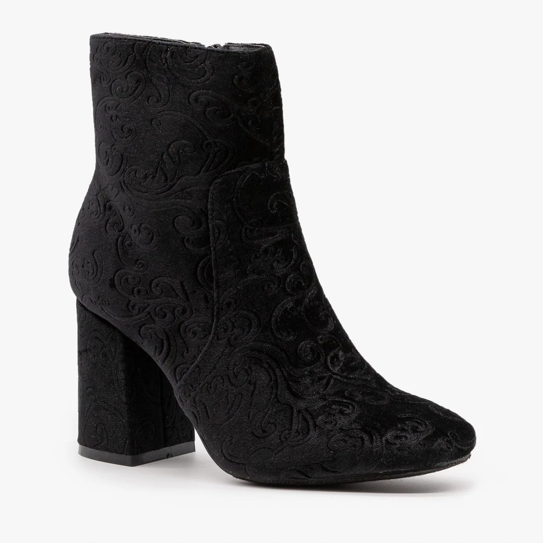 We can’t help falling in love with these Refresh Shoes Glory-01 booties, and we bet that you’ll be falling in love with them too! Beautifully crafted out of a luxurious velvet material, these booties feature a 3″ chunky heel and an interior side zipper for easy on/off access and everyday wear. These boots also feature a rounded slighty square toe for added style. Finishing off these gorgeous booties is a Baroque floral design that is featured throughout the entire shoe. Available in several different lovely colors, these booties go with just about anything in your closet! Style these booties with some ankle pants and a crop top for a cute holiday party look! You can even pair these booties with your favorite party dress for the perfect New Year’s outfit! Made with all man-made/vegan materials.