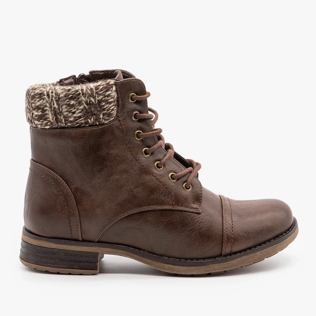Stay cute and cozy in these adorable Refresh Shoes Sammy-09 sweater knit cuffed booties! Crafted with faux leather, these booties feature a low block heel for lasting comfort and a stylish almond shaped toe. They also feature classic boot-style stitching, a lace up front for the perfect fit and a full-length inner zipper for easy on/off access. A sweater knit cuff completes the look! Pair these booties with black skinny jeans, a belt and a knotted vintage tee for an easy and comfy everyday look!