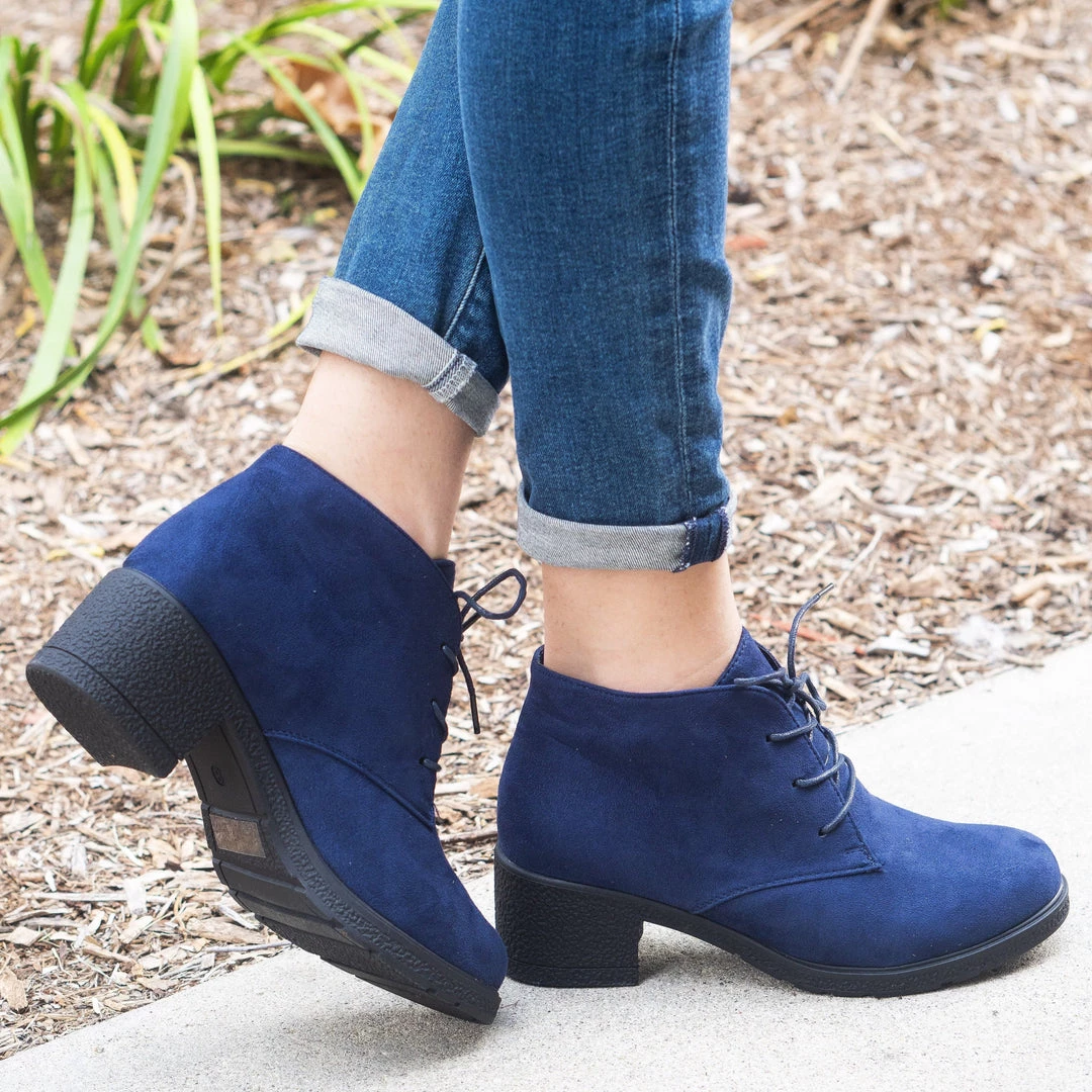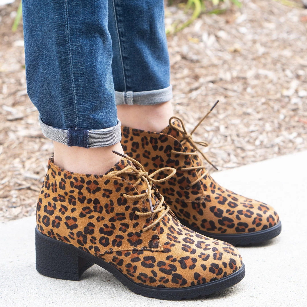 Our refresh Lindsey-01 booties are super cute, comfy and perfect for the upcoming season! They feature a soft faux-suede body with lace up detailing and wide-cute entry for easy on and off wear. A short comfortable heel can be dressed up or down and a soft rounded toe completes the look. Available in four colors/ patterns that go perfect for the fall season. Pair with jeans and a top or a pleated skirt and camisole.Â