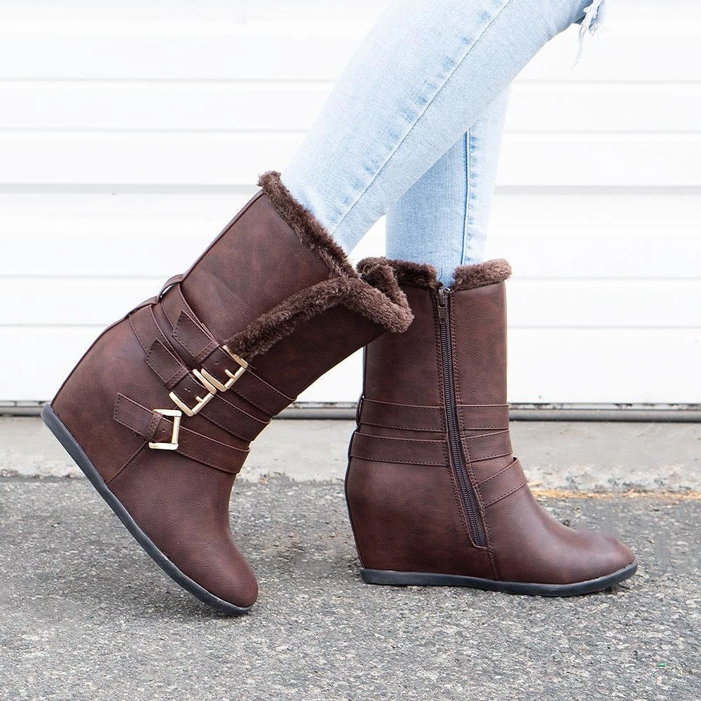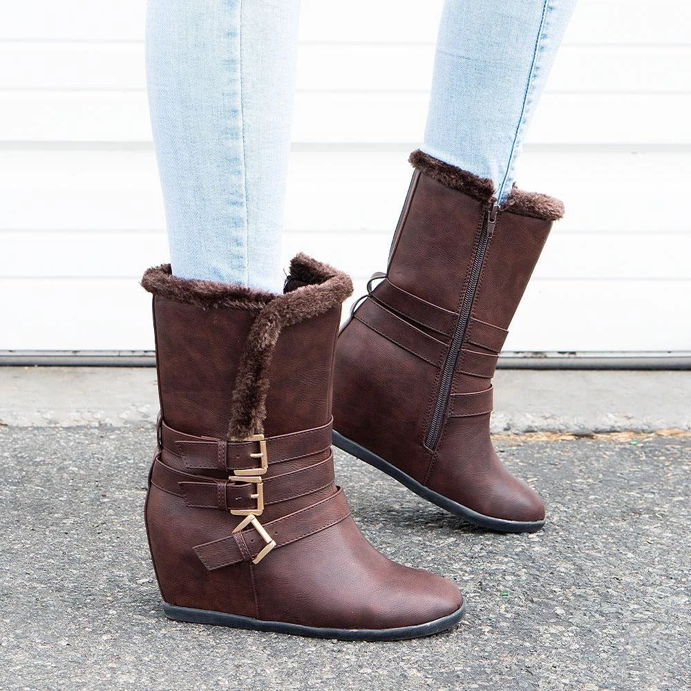 Our Reneeze Lucy-01 booties will keep you warm and looking cute this upcoming season. This gorgeous bootie is crafted with a faux-leather material and feature an approx. 3″ inner wedge that adds height and dimension. A cute faux-fur trim lines the outside stitching accompanied by 3 decorative buckles that lay on the front of the ankle giving the shoe a unique design. A classic almond toe pulls this cozy look all together while lightly padded insoles and full length inner zipper allow for easy on and off wear for maximum comfort. Pair these boots with black leggings and oversized sweater for a cute and comfy look perfect for the cold seasons.Â