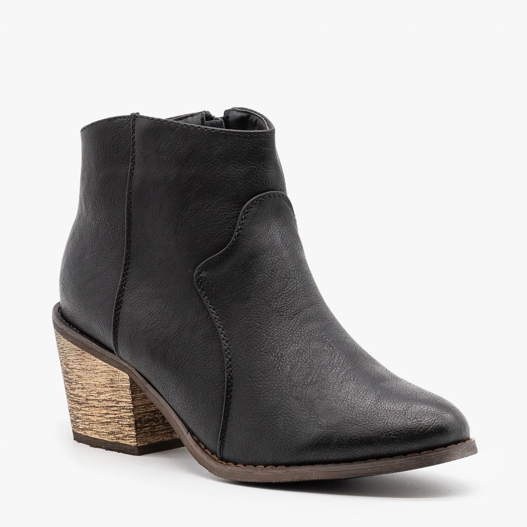 Ride off into the sunset in these cowboy boot-inspired Reneeze Shoes Roda-01 booties! These cute booties are designed with faux leather that’s lightly distressed for a classic worn look and feature an approx. 2″ chunky heel, stylish almond shaped toe and an inner zipper for easy on/off access. They rise to just over the ankle and have slightly rounded tops and accent stitching, giving them that western feel. Pair these chic booties with cuffed skinny jeans and a button up cardigan for a cute everyday look! Made with all man-made/vegan materials and runs true to size.