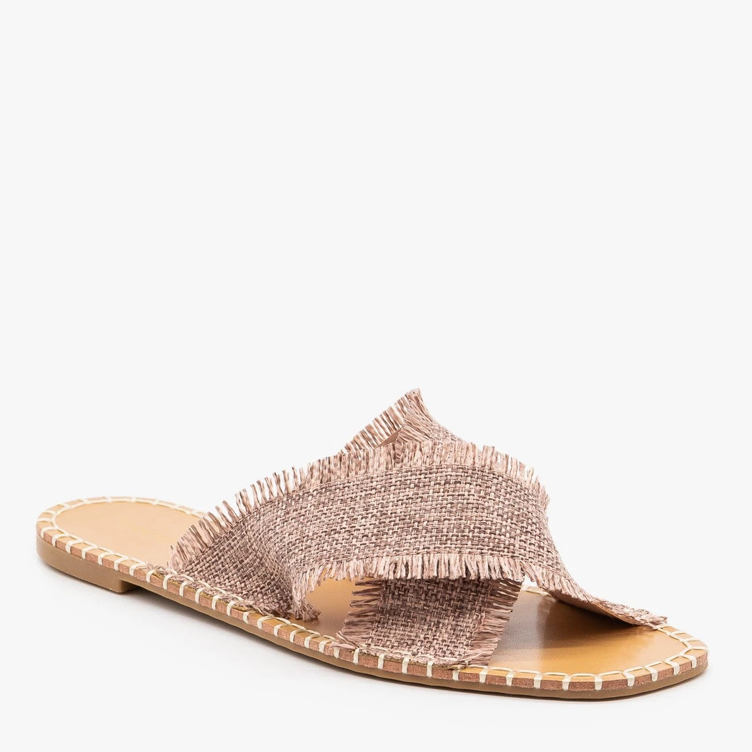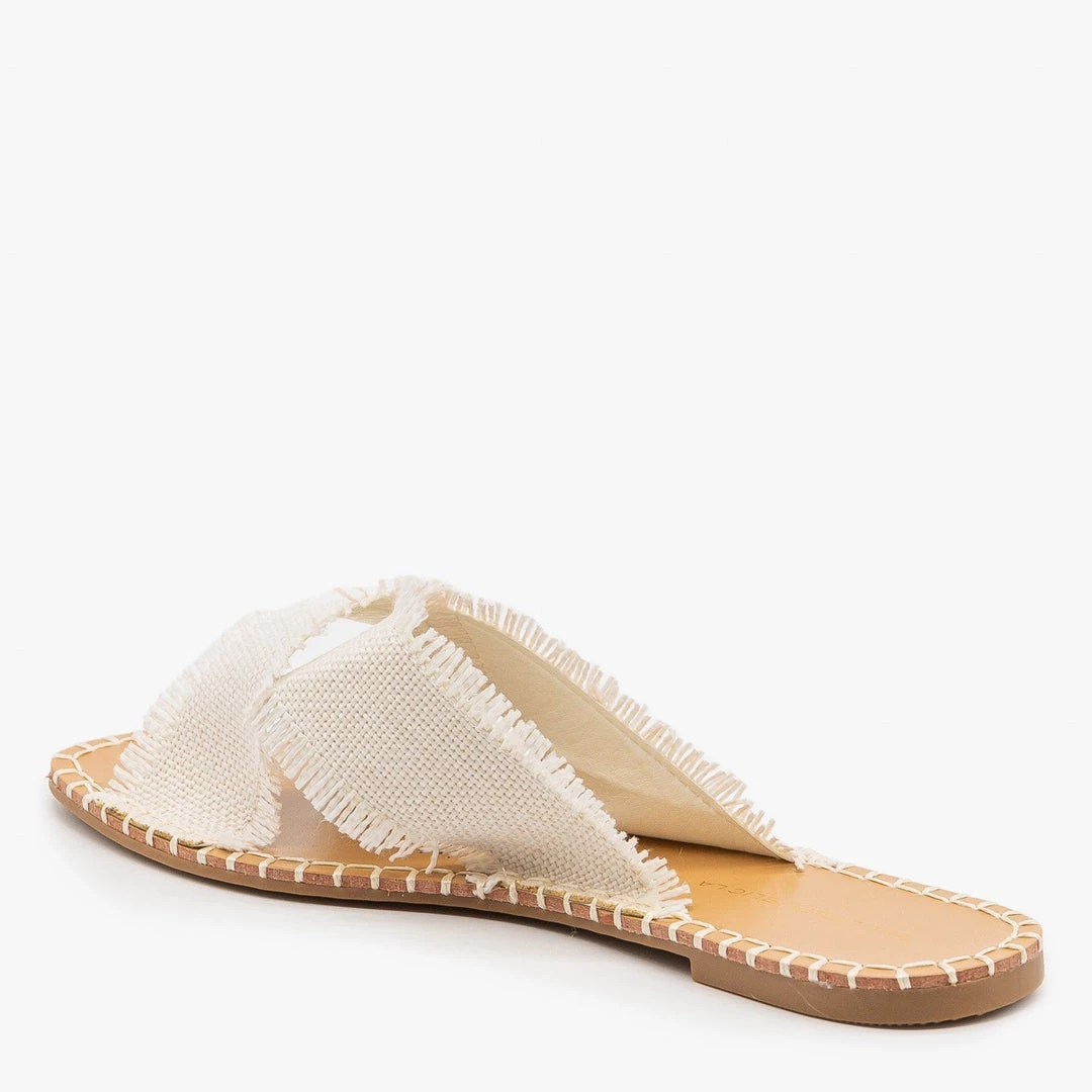 Shoe Republic LA Shoes Can sandals! These chic sandals feature a flat heel, a faux leather insole and a simple slip on design. Two faux leather bands cross each other for a cute open toe style. The bands are covered in a woven canvas material with frayed edges for that trendy boho vibe. White accent stitching along the edges pull these sandals together! Pair them with a flowy maxi skirt and a knotted white tee for a gorgeous summer look! Made with all man-made/vegan materials and runs true to size.