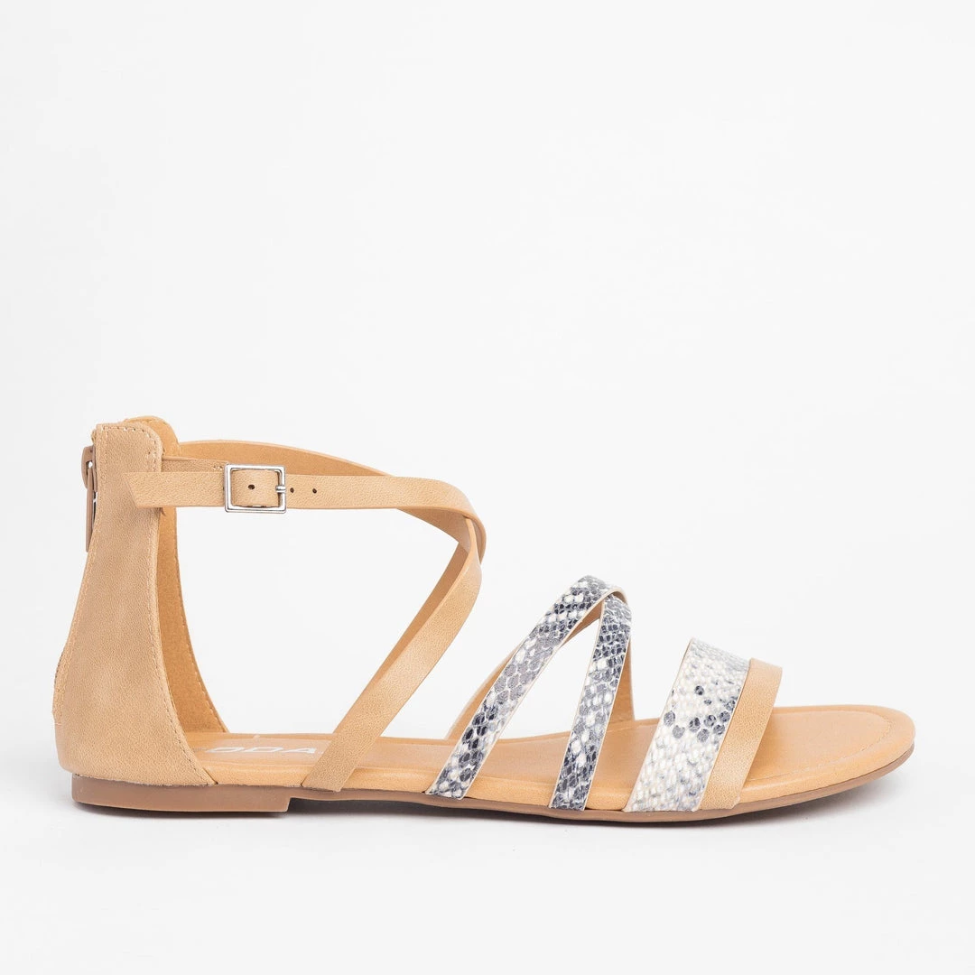 Take a walk on the wild side with these Soda Shoes World-S gladiator sandals! Beautifully crafted out of faux leather, these sandals feature a back ankle zipper for easy on/off access and a trendy strappy gladiator-style design for extra edge. The buckled accent makes these shoes looks super trendy, while the animal print design gives these shoes a sassy finishing touch. Wear these sandals with a pair of distressed cutoff denim shorts and a vintage band tee for a super cool and laid-back outfit! Made with all man-made/vegan materials.