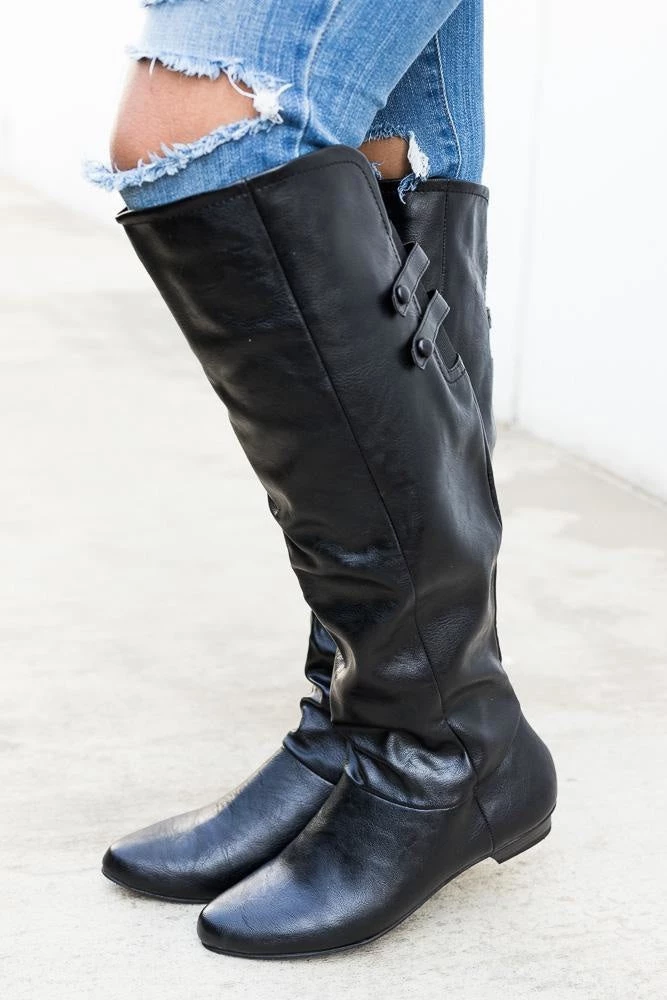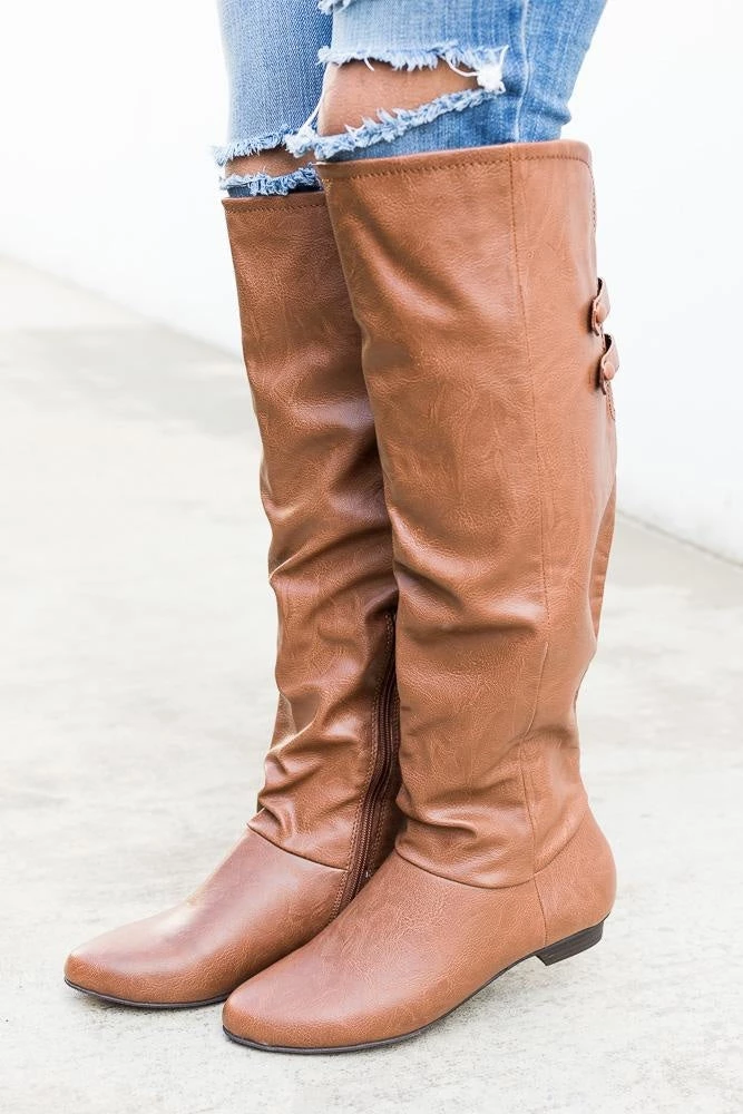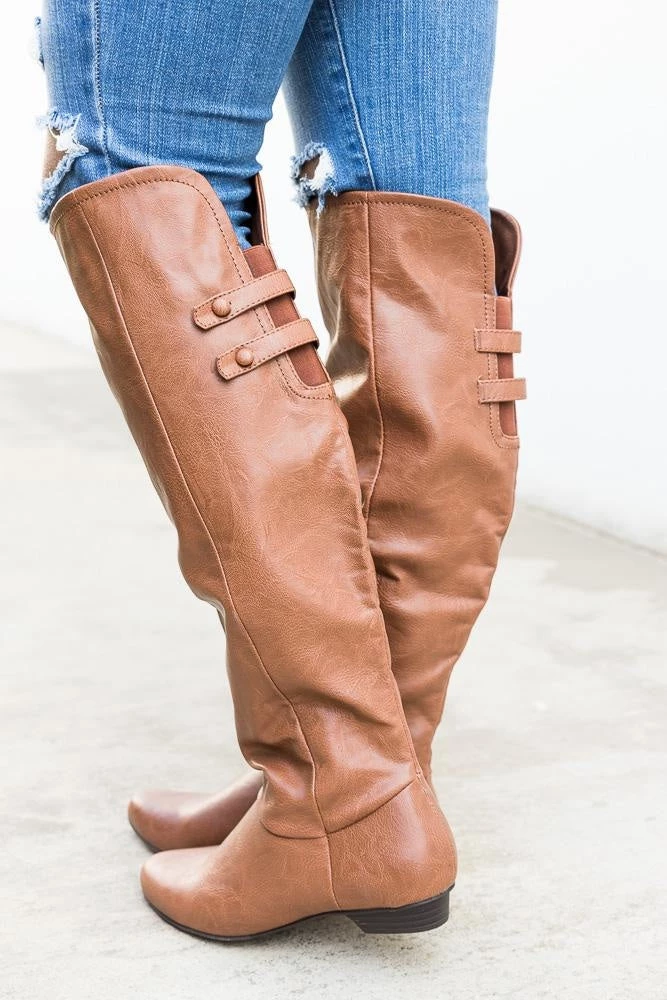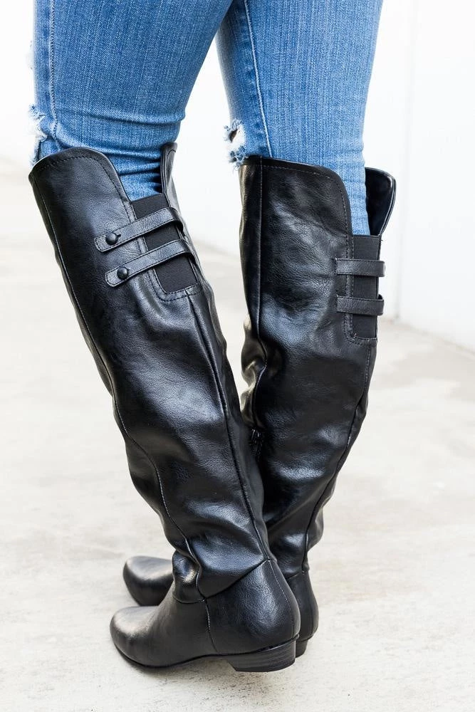 Stay in style this boot season in our Soda Shoes Trely-S boots! These boots feature a full faux leather body that rise just below the knee. The back of the boot has a cut out just behind the knee with comfy stretch material for easy wear along with two decorative straps. Crafted with an inner half zipper and light padding this is the perfect boot to wear all season long. Available in black and cognac pair these shoes with some light washed skinny jeans and oversize sweater for a cute seasonal look! This shoe is man-made with all vegan materials. Take your perfect size as this shoe runs true to size!