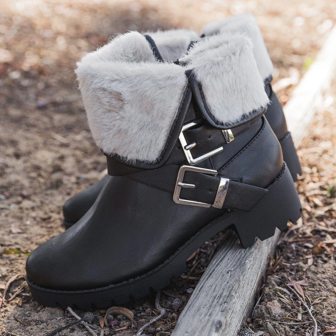 Consider yourself ready for the cold with the Soda Shoes Eris-S boots! These boots are made out of faux leather and feature a folded cuff that is made from faux fur. The rounded toe and inside padding make these shoes super cozy and comfortable enough to wear all day long. The texturized rubber sole and 1.75″ heel add height and extra grip, ensuring maximum support throughout the day. Thes boots end just above the ankle and feature an edgy criss crossed strap design, accented with metal buckles. These boots are finished off with an interior side zipper, making it easy to put these shoes on and take them off. Wear these boots with some leggings and a slouchy sweater, or with some jeans and a puffy jacket for the perfect winter ensemble! Made with all man-made/vegan materials.