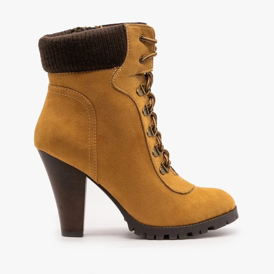 Take your outfits to new heights with these trendy Soda Shoes Rogue-S booties! Crafted from faux suede, these booties feature a cute, almond shaped toe, sturdy tread and an approx. 4″ heel to give you some extra sass. These booties lace up the front with metallic clasps that are a little more unique than traditional eyelets. There is also a full-length inner zipper that lets you slip these booties on and off with ease. A sweater-knit ankle cuff completes the look with a cozy winter touch! Pair these booties with distressed skinny jeans, a French-tucked ribbed turtleneck and some delicate jewelry for a chic chilly day look! Made with all man-made/vegan materials.
