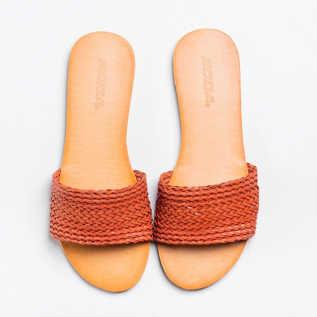 Put your best foot forward with these Soda Shoes Barrel-S slides! These beautiful slides are made out of faux leather and feature an easy-to-wear slip-on design for practicality. The gorgeous basketweave design also gives these shoes some extra style and flair. You can pair these sandals with everything from jeans to shorts to dresses! Made with all man-made/vegan materials.