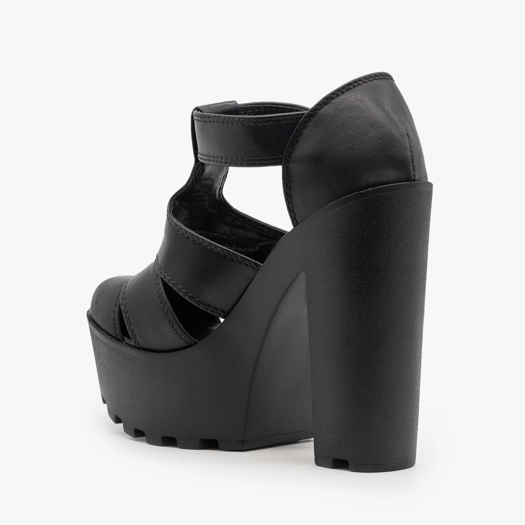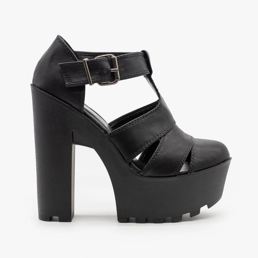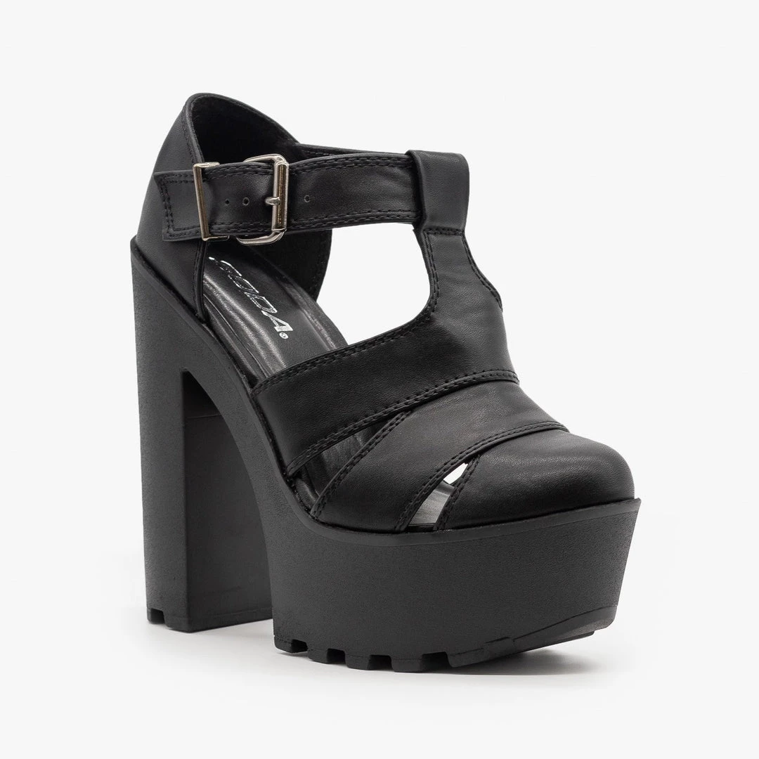 Kick up your heels in these edgy Soda Shoes Merida-S sandals! Crafted from faux leather, these sandals feature an approx. 1.75″ platform lug sole and an approx. 5″ heel that will definitely give you some edge. The sandal is designed with a closed toe, a strap over the foot and a t-strap that connects to the back ankle support and strap. A square buckle lets you adjust for the perfect fit. Pair these sandals with cuffed distressed skinny jeans, a cute crop top and a choker necklace for a cute yet edgy everyday look! Made with all man-made/vegan materials and runs true to size.