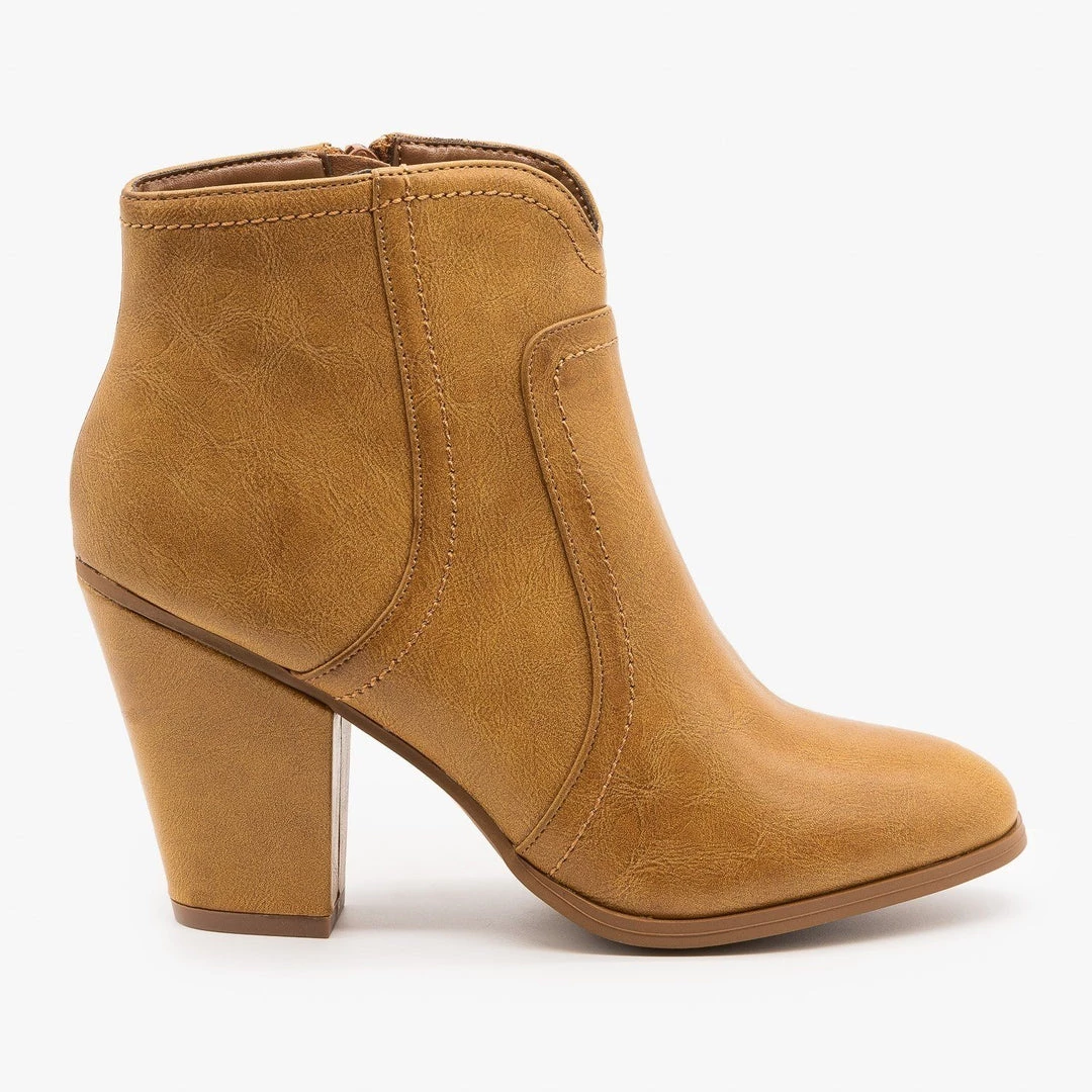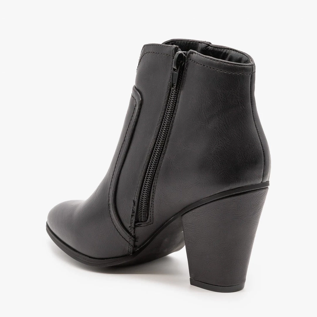 Chic ankle booties are the perfect addition to this season’s outfits! The Soda Shoes Joker-S is crafted in faux leather and features a 3.5″ chunky heel to give you some sass and an stylish almond shaped toe. Classic boot stitching accents the seams and a small cutout on the top of the bootie helps to elongate your legs. A side zipper lets you slip these booties on and off with ease. side zipper, V cut ankle, and 3.5″ stacked heel. Pair these booties with distressed black skinny jeans and a chunky sweater for a cute fall look! Made with all man-made/vegan materials and runs true to size.