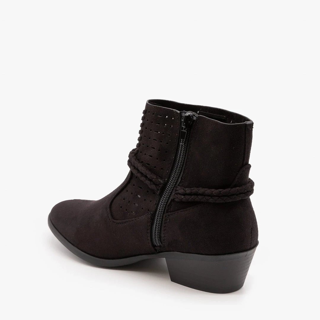Add a little flair to your outfit with these adorable Soda Shoes Amanda-S ankle booties! Designed from faux suede, these booties have an approx. 1.5″ block heel, an almond shaped toe and an inside zipper. Small laser cut designs and faux suede laces on the front and sides of the boot add a subtle pattern. For the final touch, a thick double cord is wrapped around the boot and tied in a cute knot with tassels, giving these booties just a little touch of western style! Pair these booties with some distressed denim boyfriend jeans and a patterned cardigan for a cute fall outfit! Made with all man-made/vegan materials and fits true to size.