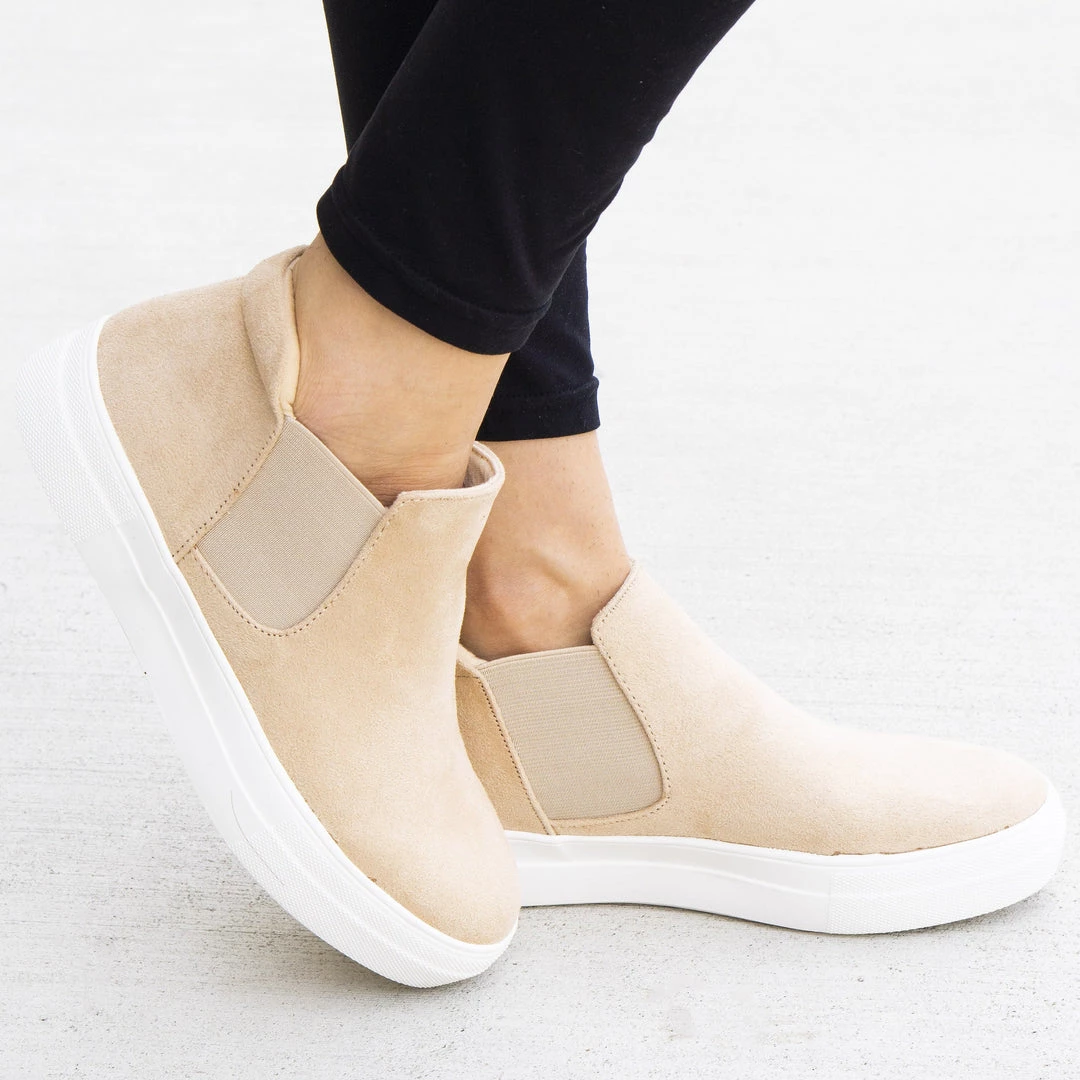Take a step in the right direction with these cute and comfy Soda Woods-G sneakers! Crafted with a lightweight faux-suede material these sneakers feature a rounded toe, cushioned insole and wide, bright white foxing for that clean and classic look. Elastic panels on both sides of the ankle add a touch of detail and let you slip these beauties on and off with ease. With a lovely natural taupe, a chic light gray and a pastel mauve option, these sneakers match any look! Pair them with distressed boyfriend jeans, a cropped sweater and an oversized utility jacket for a casual yet trendy everyday look!