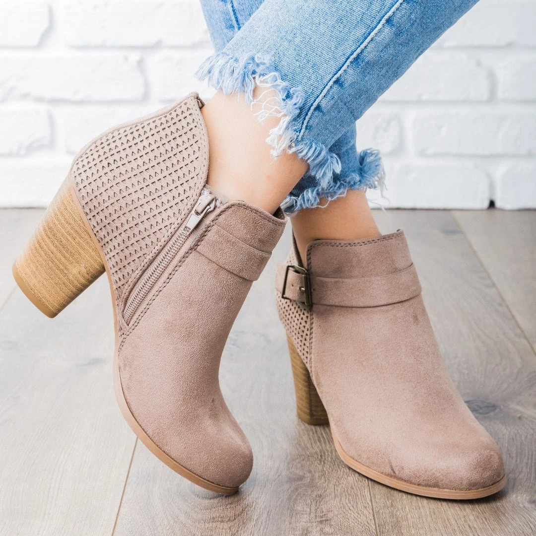 These darling booties are made with faux suede and have laser cut and buckle details. The Soda Shoes Iceage-S bootie with a 4″ heel, will be a statement boot for you outfit this season! Made with all man-made/vegan material and runs true to size.