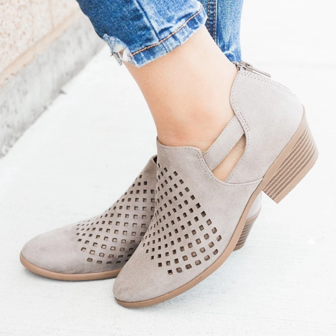 We are in love with the Soda Chopt-S for its adorable, laser-cut, perforated design! This shoe also features an ankle cut out and back zipper. This shoe is made from faux suede materials and runs true to size.